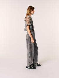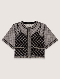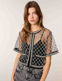 Embroidered tulle top Made from dainty tulle, this crop top features a criss-cross pattern of glittering embroidered beads for a graphic effect. The trim and mock pockets balance the interplay of see-through detailing. Versatile and assertive, it can be worn on its own or as a cardigan, layered over the removable tank top .Look glamorous day or night with jeans, a belt and pumps for effortless chic. - Short tulle top - Embroidered beads - Embroidered braid trim - Hook-and-eye fastening - Removable tank top with spaghetti straps - Designed for a boxy fit The model is 5' 10 and wears a size 1. Reference: MFPTO01114_2517 Composition & care Main material: 100% polyester Yoke: 53% polyester, 47% polyamide Interior grosgrain: 100% cotton Removable lining: 100% viscose Regular cycle 30° Do not bleach Do not tumble dry Do not iron Do not dry clean