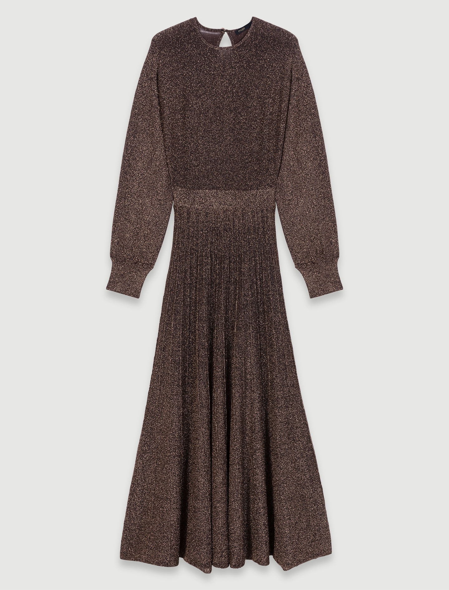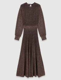 Shiny knit maxi dress The studio unveils its new collection, the epitome of Parisian chic. Elegance and sophistication unite in a subtle interplay of contrasts and proportions, giving your looks a confident, modern edge. This maxi dress is made from a shimmering knit and is sure to make you sparkle both day and night. Alongside a round neck, long sleeves and gathered cuffs, it has a slit at the back with a buttoned teardrop opening. The cinched waist opens into a daintily pleated skirt with a flared fit. Style your look with statement accessories like a shoulder bag and ankle boots for a chic, irresistible look. - Knit maxi dress - Round neck - Long sleeves - Ribbed waistband - Pleated flared skirt - Gathered ribbed cuffs - Teardrop opening at back The model is 5' 10 and wears a size 36. Reference: MFPRO03833_9974 Composition & care Main material: 45% polyester, 27% polyamide, 26% metalized fibers, 2% elastane Waistband: 53% polyester, 30% metalized fibers, 16% polyamide, 1% elastane Cuff: 50% polyester, 29% metalized fibers, 20% polyamide, 1% elastane Hand wash Do not bleach Do not tumble dry Iron at a maximum temperature of 110°C without steam F - Professional dry clean, with hydrocarbon solvent, normal treatment