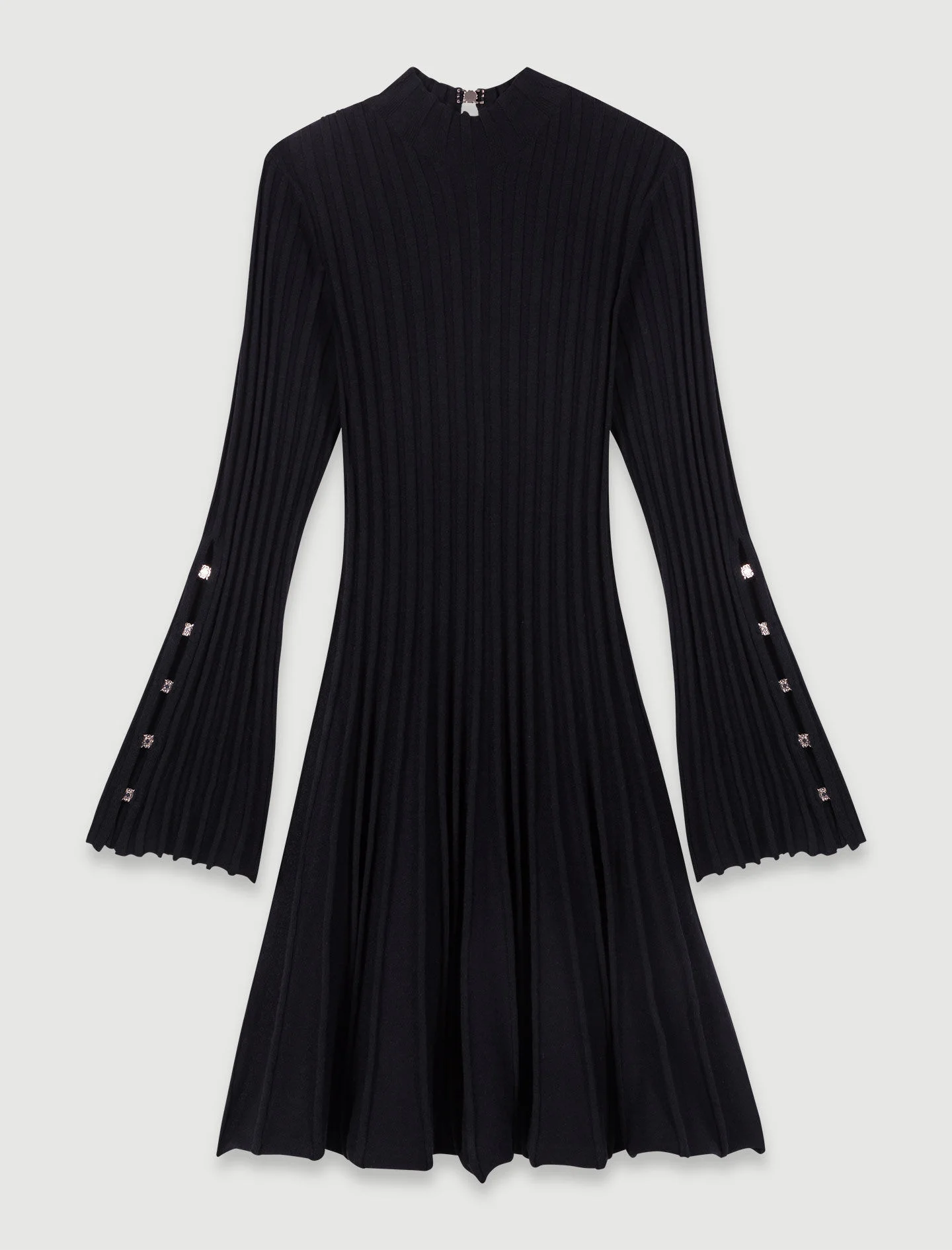 Short knit dress The studio unveils its new collection, the epitome of Parisian chic. Elegance and sophistication unite in a subtle interplay of contrasts and proportions, giving your looks a confident, modern edge. Made from a fine ribbed knit, this short, fitted dress has a flattering flared skirt. Featuring a high neck and flared long sleeves, it has split cuffs with small Clover tags and a teardrop opening at the back embellished with small hooks. For a chic, casual look, create a new twist by teaming with loafers slipped into socks. - Fine rib-knit short dress - High round neck - Long flared sleeves - Split cuffs with small Clover tags - Teardrop opening at back with small Clover hooks - Flared skirt The model is 5' 10 and wears a size 36. Reference: MFPRO03828_2517 Composition & care Main material: 33% polyester, 31% polyamide, 18% acrylic, 16% wool, 2% elastane Hand wash Do not bleach Do not tumble dry Iron at a maximum temperature of 110°C without steam F - Professional dry clean, with hydrocarbon solvent, normal treatment