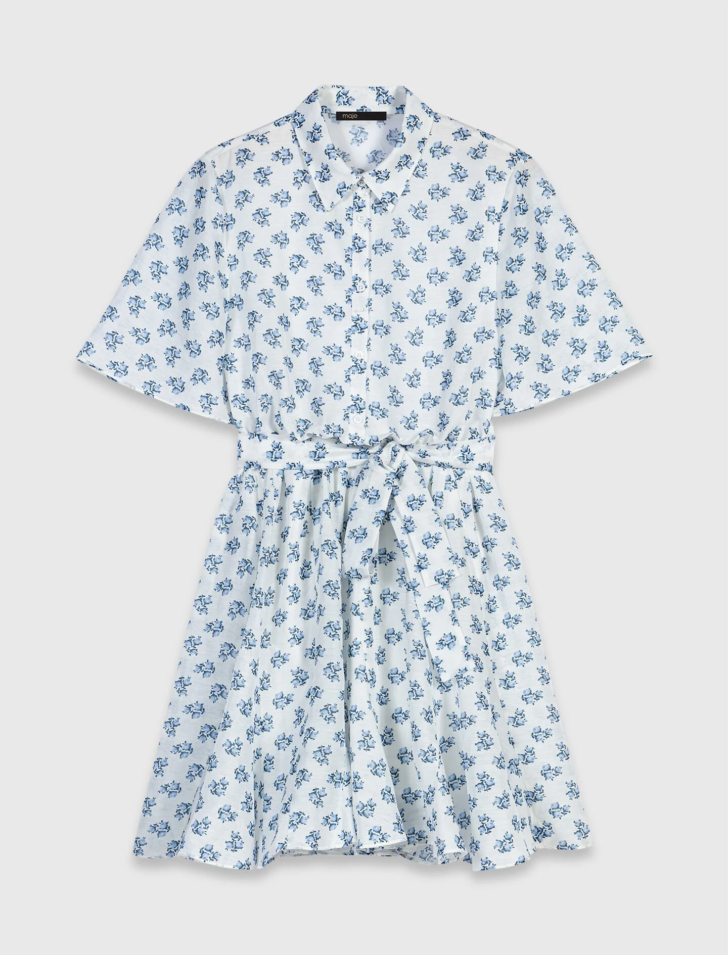 Short patterned linen-blend dress On sunny shores, the Maje woman has a spontaneous, sophisticated look, blending retro softness with summer freshness. This short shirt dress is captivating with its blue bouquet print on a white background and its subtly slubbed linen, combining a structured top with a flared skirt. A tie belt accentuates the waist, while the wide sleeves and white buttons add a touch of casual elegance. - Floral print short shirt dress - Light and textured linen fabric - Matching tie-waist belt - Wide short sleeves - Small white button fastening - Fit and flare cut Reference: MFPRO04748_D058 Composition & care Main material: 55% linen, 45% viscose Lining: 100% viscose Buttons: 100% nacre Regular cycle 30° Do not bleach Do not tumble dry Iron at a maximum temperature of 110°C without steam F/ - Professional dry clean, with hydrocarbon solvent, gentle treatment