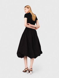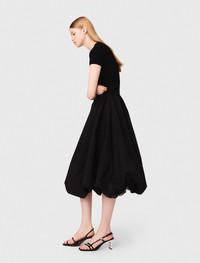 Long ribbed knit and taffeta dress This season, Maje plays with materials and volumes to offer modern and elegant pieces, perfect for the new term. This long dual-material dress combines the comfort of ribbed knit with the lightness and volume of taffeta. The top with a round neckline and short sleeves ensures a clean silhouette, while the voluminous taffeta skirt with a bubble effect creates a lovely contrast. Ideal for a special event, it draws all the attention with its unique cut. To complete the look, add mirror-heeled sandals and a signature bag for an outfit that is both elegant and bold. - Long dual-material dress - Ribbed knit top with round neckline and short sleeves - Voluminous taffeta skirt with bubble effect - Designed for a standard fit The model is 5' 10 and wears a size 36. Reference: MFPRO04334_2517 Composition & care Top: 60% viscose, 39% polyamide, 1% elastane Bottom: 100% polyester Lower lining: 52% polyamide, 48% polyester Hand wash Do not bleach Do not tumble dry Iron at a maximum temperature of 110°C without steam F - Professional dry clean, with hydrocarbon solvent, normal treatment