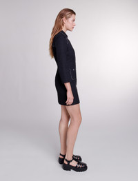 Short tweed dress Discover our new collection – a bold reinterpretation of Maje classics. Iconic pieces are transformed with contrast materials and careful details to enhance your looks. Suitable for both daytime and evening wear, this short tweed dress has a fitted and stylish look. This dress is lined and has a classic collar and long sleeves, alongside a press-stud fastening and two buttoned patch pockets. A fitted waist and edges accentuated by silver-tone chains create elegant lines. - Short tweed dress - Silver chain detailing - Press stud fastening The model is 5' 10 and wears a size 36. Reference: MFPRO03334_2517 Composition & care Main fabric: 100% polyester Lining: 90% polyamide, 10% elastane Sleeve lining: 100% polyester Pocket lining: 100% cotton Do not wash Do not bleach Do not tumble dry Do not iron F - Professional dry clean, with hydrocarbon solvent, normal treatment