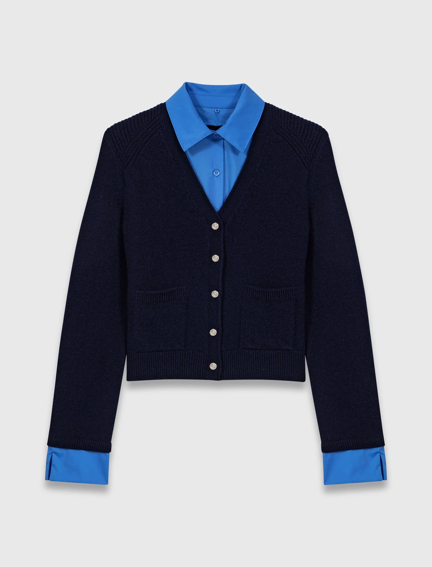 Cardigan with removable details In this collection, Maje unveils modern and sophisticated pieces, ideal for transitioning between seasons in style. This short cardigan stands out for its versatility: a 2-in-1 effect that combines comfort and originality, with removable shirt-style panels for different ways to wear it. Designed for an assertive silhouette, it features practical patch pockets and a button fastening. Perfect for a metropolitan, contemporary style, it adapts to all your looks, from the most casual to the most chic. Pair it with a tweed skirt, and signature accessories, like a bag and loafers. - Short 2-in-1 effect cardigan - Removable shirt panels - 2 patch pockets - Designed for a slim fit The model is 5' 11 and wears a size 1. Reference: MFPCA00649_0103 Composition & care Main material: 100% wool Secondary material: 77% cotton, 20% polyamide, 3% elastane Hand wash Do not bleach Do not tumble dry Iron at a maximum temperature of 110°C without steam Do not dry clean