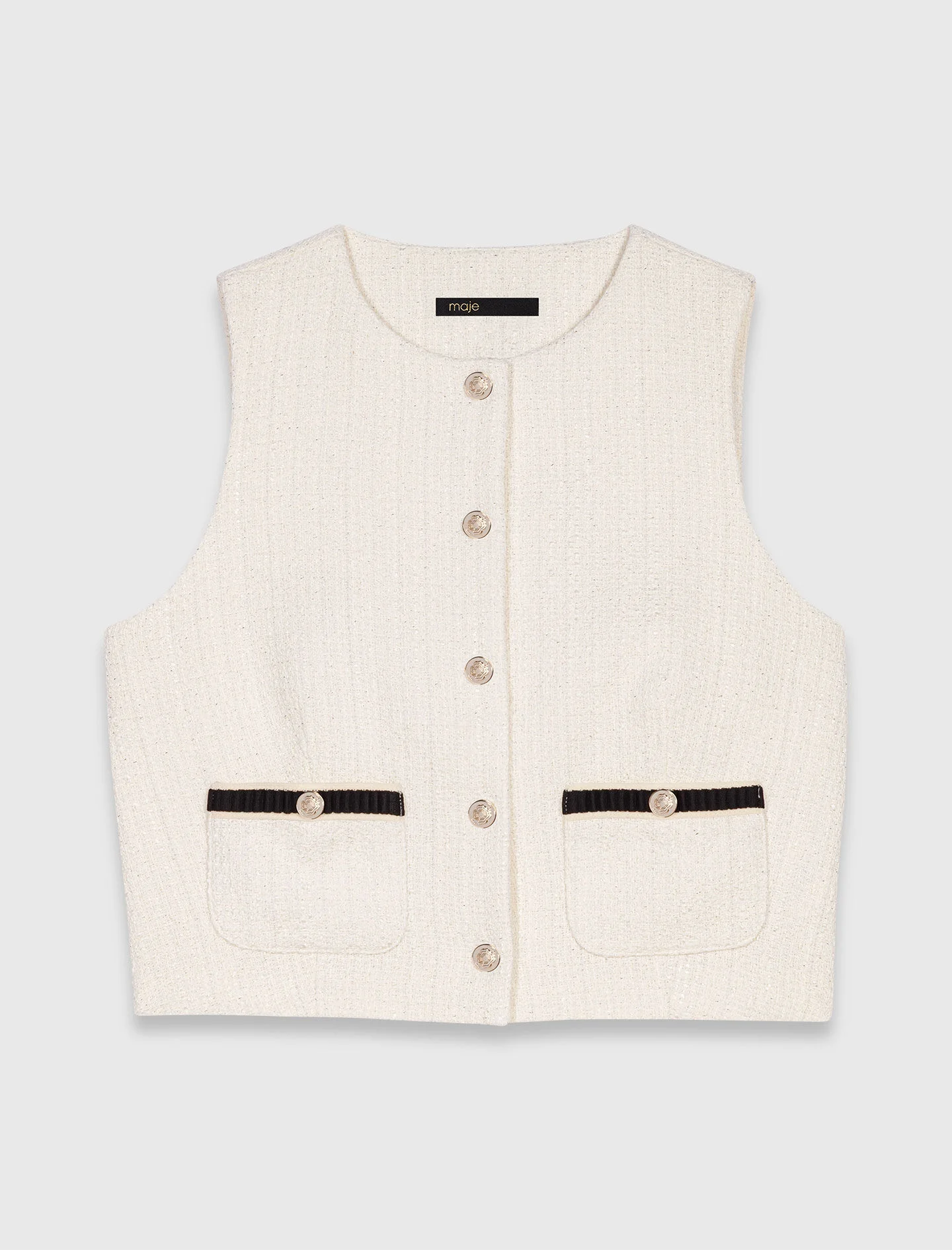 Sleeveless tweed lurex top Maje offers a collection of modern and elegant pieces to transition through the seasons with ease. This sleeveless lurex tweed top embodies subtle and modern elegance. Its round neck and button fastening provide delicate structure, while the patch pockets add a practical and refined touch. To complete the look, pair it with a belted black trouser for a sharp and chic silhouette. Add silver accessories like a signature fringed bag for an elegant and contemporary finishing touch. - Sleeveless tweed-effect waistcoat - Round neck and button fastening - 2 patch pockets - Designed for a standard fit The model is 5' 9 and wears a size 36. Reference: MFPTO01210_0101 Composition & care Main material: 60% cotton, 20% polyester, 14% acrylic, 3% polyamide, 2% viscose, 1% metalized fibers Lining: 100% viscose Braid: 96% polyester, 4% elastane Do not wash Do not bleach Do not tumble dry Iron at a maximum temperature of 110°C without steam F/ - Professional dry clean, with hydrocarbon solvent, gentle treatment