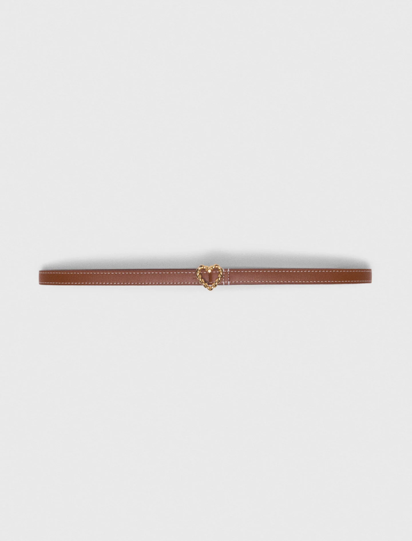 Slim leather heart belt As the seasons change, Maje creates accessories imbued with elegance and sophistication for a stylish way to set off your look. Slim and delicate, this belt features signature details with a small gold heart and contrasting topstitching. A subtle accessory to accentuate the waist with style. Wear it over a floaty dress or high-waisted trousers. - Slim belt - Gold heart detail - Contrasting topstitching - Width: 1cm Reference: MFACE00446_0067 Composition & care Main material: cow leather Lining: 91% polyester, 9% viscose Coating: 100% polyurethane Buckle: 100% zamac Do not wash Do not bleach Do not tumble dry Do not iron Do not dry clean
