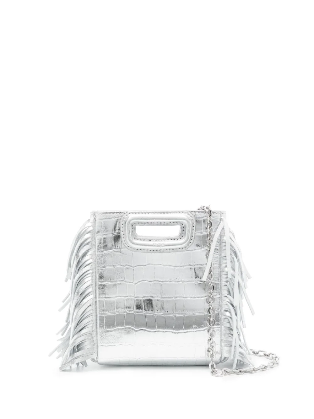 mini M crocodile-embossed tote bag Highlights - Silver-tone - Sheepskin/calf leather - Smooth grain - Laminated finish - Embossed crocodile effect - Tonal stitching - Fringe detailing - Embossed logo to the front - Concealed magnetic fastening - Cut-out top handle - Detachable chain-link shoulder strap - Adjustable detachable shoulder strap - Main compartment - Full lining - Silver-tone hardware - This piece comes complete with a protective dust bag. Imported Composition Outer: Sheepskin 100%, Calf Leather 100%, Brass 100% Lining: Polyester 100% SIZE & FIT Model measurements Height 5 ft 11 in(1.8 m) Bust/Chest 31.49 in(80 cm) Hips 36.61 in(93 cm) Waist 24.4 in(62 cm) Measurement DEPTH 1.96 in(5 cm) HEIGHT 6.29 in(16 cm) STRAP 49.21 in(125 cm) WIDTH 6.29 in(16 cm)