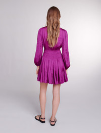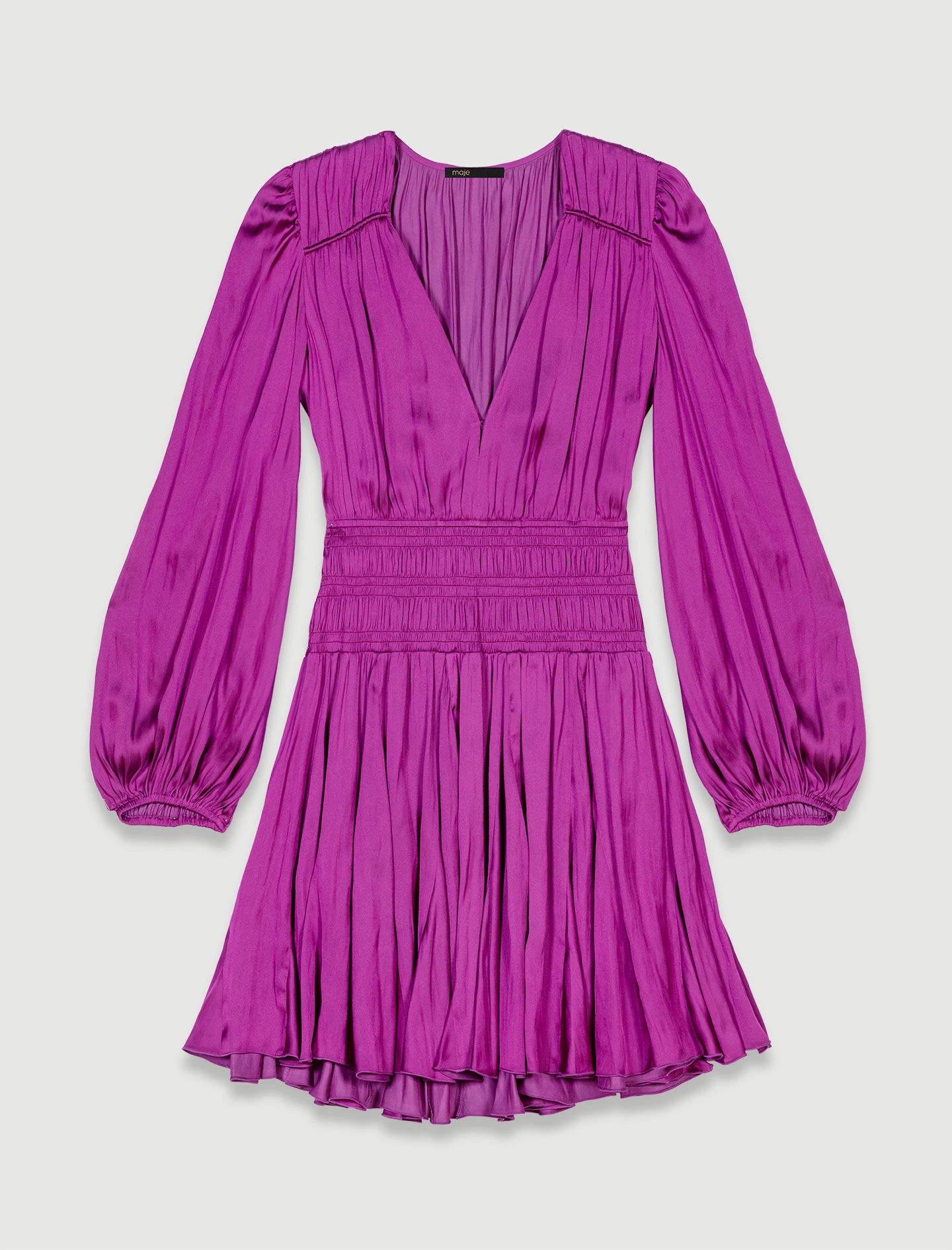 Short satin-look dress Discover our new collection – a bold reinterpretation of Maje classics. Iconic pieces are transformed with contrast materials and careful details to enhance your looks. This short dress has a satin finish and creates an effortlessly stylish look, perfect for any occasion. It has long sleeves with elasticated cuffs, a V-neckline and gathered shoulders. The waist is subtly smocked, while the fluid, asymmetric, skater-style skirt features pleat and ruffle detailing. - Short pleated dress with satin finish - Asymmetric ruffle skirt - Smocked waistband The model is 5' 10 and wears a size 36. Reference: MFPRO03360_F035 Composition & care Main fabric: 100% polyester Regular cycle 30° Do not bleach Do not tumble dry Iron at a maximum temperature of 110°C without steam F/ - Professional dry clean, with hydrocarbon solvent, gentle treatment