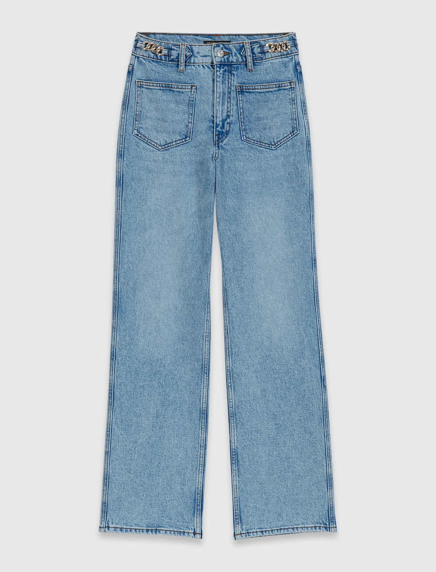 Straight jeans with chains With a focus on urban style and boldness, the Maje woman reinvents the classic look of jeans with precious details and a touch of character. These jeans have a straight, slightly flared cut, accentuated by a gold-tone curb chain at the waist and large patch pockets that modernise the silhouette. The ochre topstitching enhances the light blue denim, while the calfskin leather jacron adds a premium, assertive touch. - High-waisted straight-leg flared jeans - Gold-tone curb chain on the front belt loops - Large patch pockets on the front - Ochre-coloured contrast topstitching - Cotton denim and calfskin leather jacron Reference: MFPJE00787_0201 Composition & care Main material: 99% cotton, 1% elastane Bias binding: 100% polyester Jacron: calfskin leather Regular cycle 30° Do not bleach Do not tumble dry Iron at a maximum temperature of 110°C without steam Do not dry clean