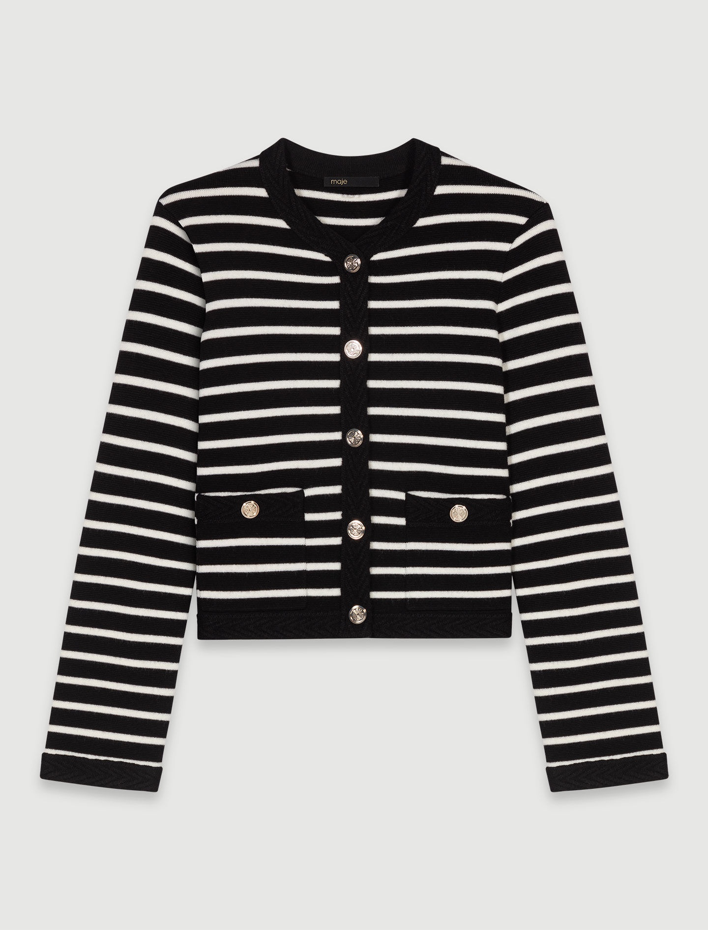 Striped cardigan With contrasting stripes, this straight-fit stretch knit cardigan creates a structured silhouette with a touch of elegance. Featuring a V-neck and two pockets, it has contrasting braided edges and a gold Clover press-stud fastening. For wearing when the mood strikes you. Pair with jeans and pumps. - Thick stretch knit straight-fit cardigan - Contrasting stripes - Contrasting, braided edges - V-neck - Clover press-stud fastening - 2 patch pockets The model is 5' 10 and wears a size 36. Reference: MFPCA00521_0303 Composition & care Main material: 45% acrylic, 44% wool, 9% polyamide, 2% elastane Tab: 49% acrylic, 44% wool, 7% polyamide Pocket: 49% acrylic, 44% wool, 7% polyamide Hand wash Do not bleach Do not tumble dry Iron at a maximum temperature of 110°C without steam Do not dry clean