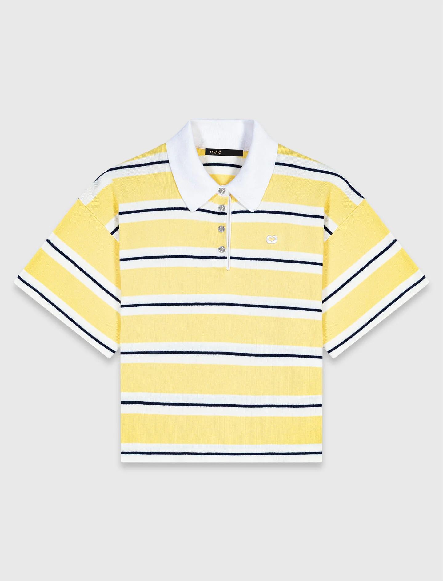 Striped short-sleeve polo A sunny mood infuses the wardrobe, capturing the spirit of the French Riviera with a nonchalant allure, where luminous colours and precious details reinvent the summer silhouette. This fine-knit polo shirt combines graphic stripes with a cropped cut, accentuated by a smooth white collar, sparkling jewel buttons and a subtle embroidered logo. Made mainly from cotton, a touch of silk adds an elegant and refined soft feel. - Cropped striped knit polo shirt - Contrasting white collar in a smooth knit - Silver-tone jewel buttons with rhinestones - Embroidered logo on the chest - Made from cotton with a touch of silk for softness The model is 5' 9 and wears a size FR 1. Reference: MFPPU01016_0259 Composition & care Main material: 68% cotton, 22% polyamide, 10% silk Tab: 53% polyamide, 41% cotton, 6% silk Embroidery: 100% viscose Collar: 53% polyamide, 41% cotton, 6% silk Regular cycle 30° Do not bleach Do not tumble dry Iron at a maximum temperature of 110°C without steam F - Professional dry clean, with hydrocarbon solvent, normal treatment