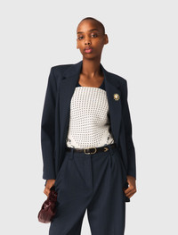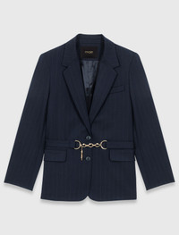 Striped suit jacket Rigorous tailoring meets bold gold details to reinvent contemporary elegance. This suit jacket, made from a majority wool blend and featuring a light blue pinstripe pattern, has a structured silhouette fastened with a tone-on-tone button and accentuated by a removable gold chain belt at the waist. The Maje logo jacquard lining and the charm on the belt add a luxurious touch. A statement piece, wear it with the matching suit trousers, a bandana tied over a black top, a brooch to decorate the jacket and a mini clutch for a bold, radiant look. - Pinstripe suit jacket - Straight, single-button fit - Removable waist belt with gold chain and charms - Flap pockets and welt chest pocket - Maje logo jacquard lining Reference: MFPVE00754_0103 Composition & care Main material: 54% wool, 41% polyester, 5% elastane Lining: 100% viscose Do not wash Do not bleach Do not tumble dry Iron at a maximum temperature of 110°C without steam F/ - Professional dry clean, with hydrocarbon solvent, gentle treatment