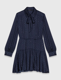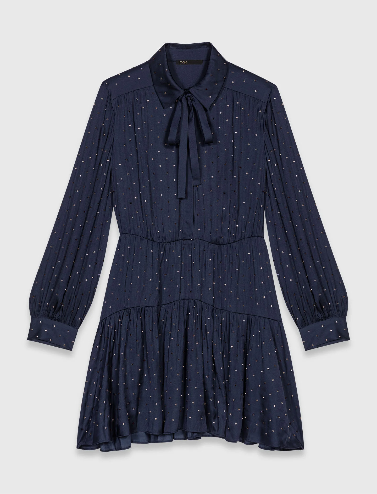 Studded flowing shirt dress The collection highlights luminous details and refined cuts, balancing couture spirit with effortless fluidity. This short satin shirt dress with long sleeves is adorned with all-over sparkling rhinestones. At the collar, a pussy bow offers different styles: tied or untied. Its gathered skirt adds movement to the silhouette, perfect with sandals and a jewelled belt at the waist. - Satin shirt dress embellished with rhinestones - Shirt collar with removable pussy bow - Long sleeves with buttoned cuffs and gathered skirt - Designed for a standard fit - The collection highlights luminous details and refined cuts, balancing couture spirit with effortless fluidity. - This short satin shirt dress with long sleeves is adorned with all-over sparkling rhinestones. At the collar, a pussy bow offers different styles: tied or untied. - Its gathered skirt adds movement to the silhouette, perfect with sandals and a jewelled belt at the waist. Reference: MFPRO04348_0103 Composition & care Main material: 100% polyester Hand wash Do not bleach Do not tumble dry Iron at a maximum temperature of 110°C without steam F/ - Professional dry clean, with hydrocarbon solvent, gentle treatment