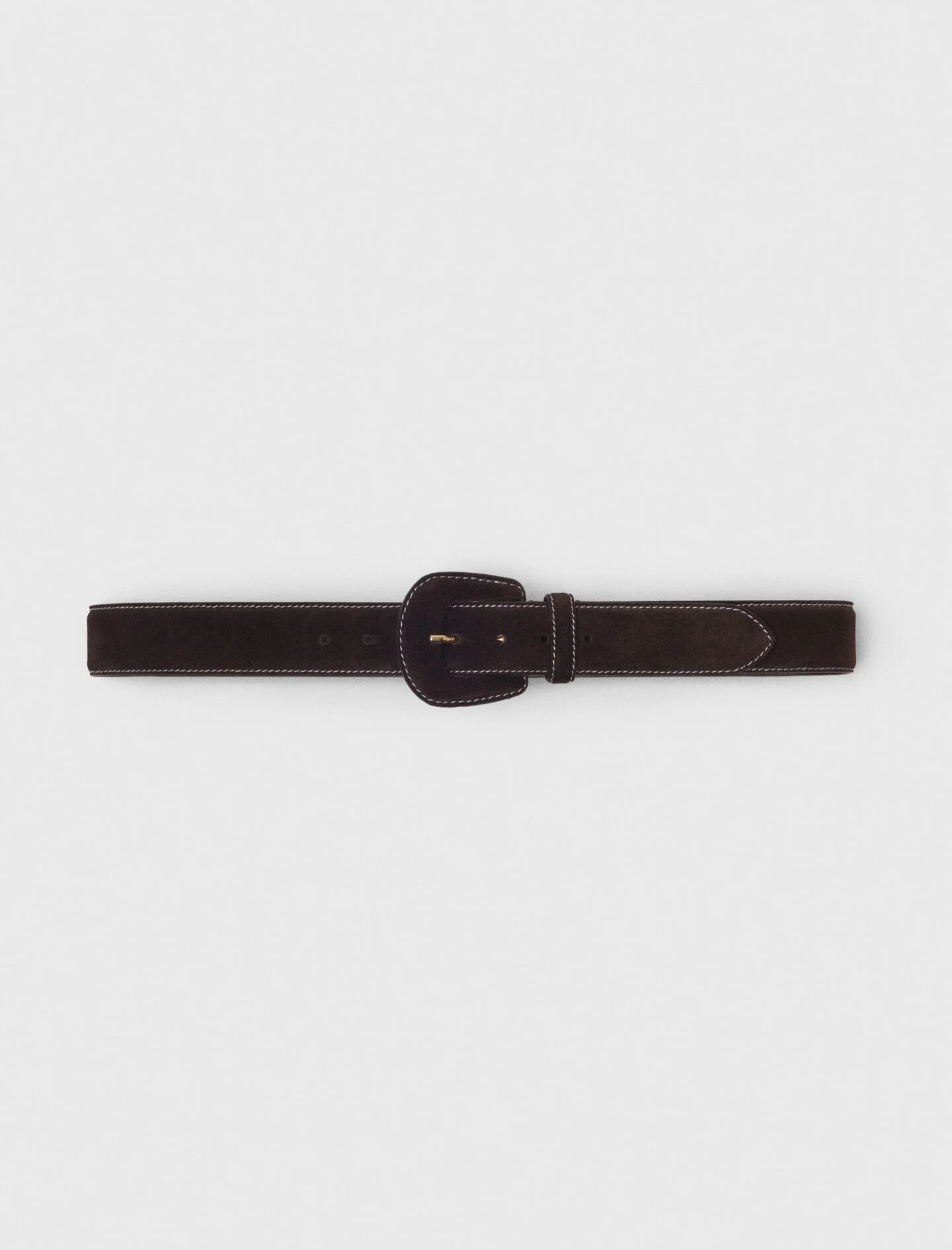 Suede belt As the seasons change, Maje creates accessories imbued with elegance and sophistication for a stylish way to set off your look. Playing on contrasts, this suede belt enhances all your silhouettes with character. Its intense colour and contrasting stitching make it a statement piece. - Suede belt - Contrasting stitching - Covered buckle Reference: MFACE00445_0609 Composition & care Main material: cow split leather Lining: 70% polyester, 30% viscose Coating: 100% polyurethane Do not wash Do not bleach Do not tumble dry Do not iron Do not dry clean