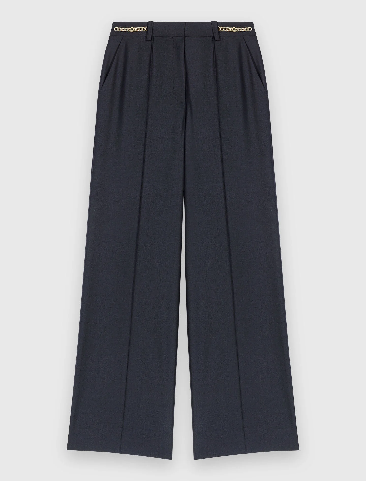 Suit trousers with chain detail The collection celebrates structured elegance, with precise lines and subtly integrated jewellery details. These suit trousers embrace modernity with their chain links at the waist and impeccable straight cut. Pair with a Breton top and characterful accessories like a fringed bag and leather ankle boots for a bold look from morning to night. - Straight-cut suit trousers - Decorative chain links at the waist - Zip fastening and welt pockets on the back - Designed for a standard fit The model is 5' 10 and wears a size 36. Reference: MFPPA00741_0103 Composition & care Main material: 52% polyester, 43% wool, 5% elastane Lining: 100% viscose Do not wash Do not bleach Do not tumble dry Iron at a maximum temperature of 110°C without steam F - Professional dry clean, with hydrocarbon solvent, normal treatment