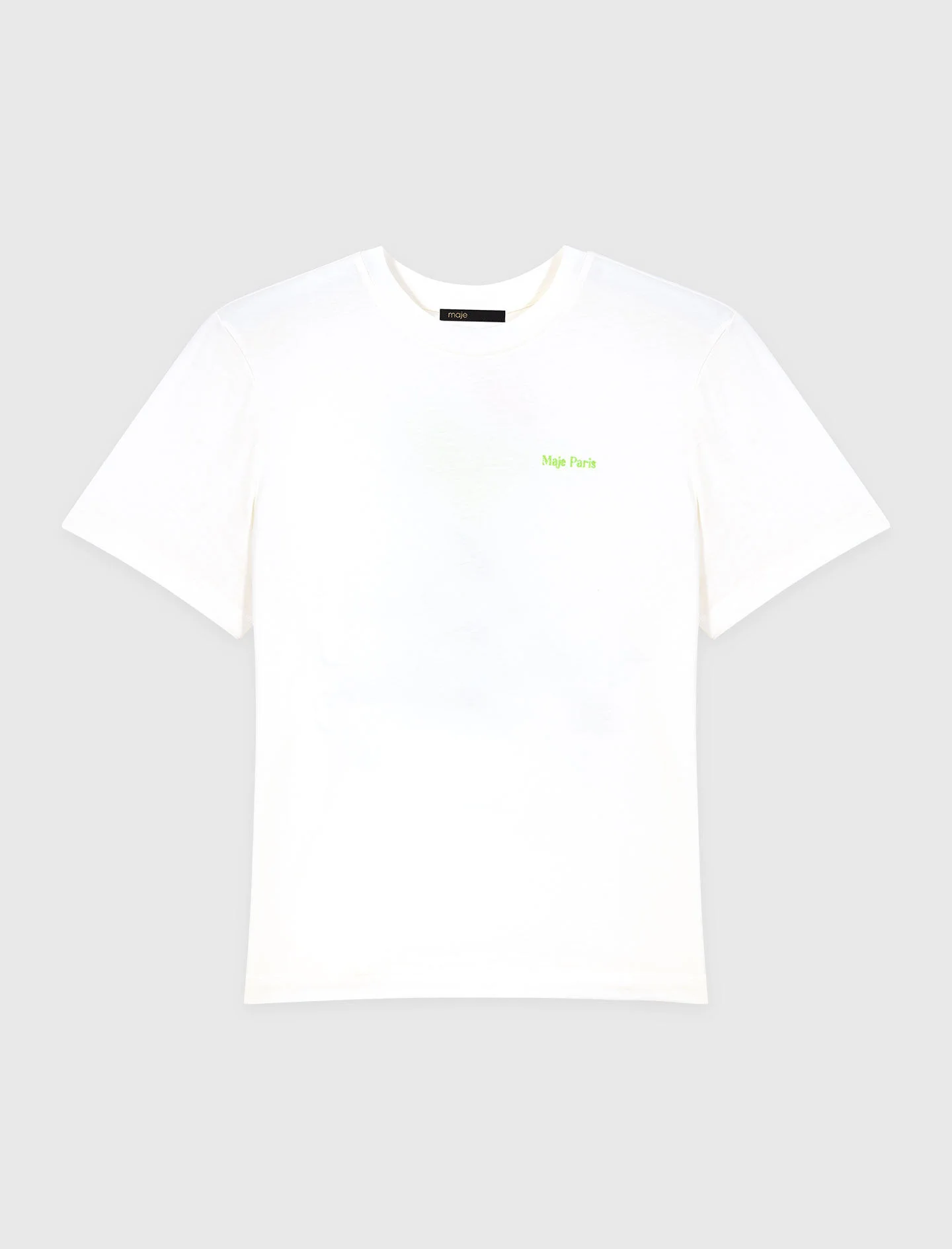Summer print T-shirt Between sun-drenched energy and a holiday spirit, the collection is an invitation to get away from it all, with pieces that exude joy and freshness for anyone who loves to celebrate the moment. This straight-cut cotton T-shirt features a discreet signature on the front and a cocktail illustration on the back, accented with colourful details, graphic text and a distinctly joyful look. The rolled-up sleeves and matte finishes make for a casual style you can wear all summer long. Pair it with light blue bubble shorts , a sailor hat and a mini mesh Miss M, then finish off with flat camel sandals for an urban summer look. - Off-white cotton T-shirt - Green Maje Paris lettering on the chest - Large cocktail print and BEACH CLUB message on the back The model is 5' 10 and wears a size FR 1. Reference: MFPTS01026_10 Composition & care Main material: 100% cotton Regular cycle 30° Do not bleach Do not tumble dry Iron at a maximum temperature of 110°C without steam F - Professional dry clean, with hydrocarbon solvent, normal treatment