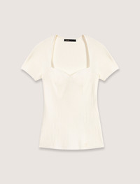 Knit top This season, the studio has conjured up a dainty, casual wardrobe where timeless pieces have been reinvented with daring tailoring and feminine details. This rib knit and stretch top has a second-skin effect and is a must-have for season after season. It has short sleeves as well as attractive topstitch details on the chest and a square sweetheart neckline. It's easy to mix and match and goes well with loose-fit trousers, a bag and sandals. - Square sweetheart neckline top - Ribbed knit - Topstitching Reference: MFPPU00775_0101 Composition & care Main material: 55% viscose, 43% polyamide, 2% elastane Rib: 56% viscose, 42% polyamide, 2% elastane Hand wash Do not bleach Do not tumble dry Iron at a maximum temperature of 110°C without steam F - Professional dry clean, with hydrocarbon solvent, normal treatment