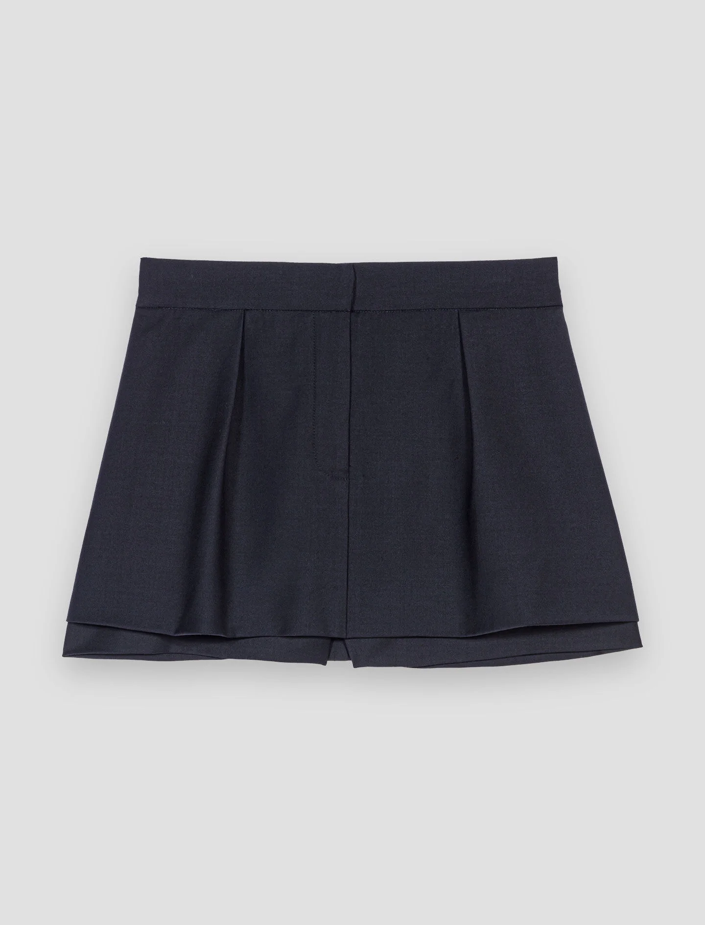 Skort The collection offers a new take on tailoring, combining light structure with subtle femininity. These skirt-effect shorts have a neat cut with marked darts and a semi-elasticated waist for comfortable wear. Chic and timeless, they pair well with the season's signature T-shirt, a pocket bag and leather boat loafers. - Tailored skirt-effect shorts - Marked darts and zip fastening at the waist - Semi-elasticated back detail for added comfort - Runs small, size up The model is 5' 10 and wears a size 36. Reference: MFPSH00686_0103 Composition & care Main material: 52% polyester, 43% wool, 5% elastane Lining: 100% viscose Belt lining: 100% cotton Inner fabric: 100% polyester Do not wash Do not bleach Do not tumble dry Iron at a maximum temperature of 110°C without steam F - Professional dry clean, with hydrocarbon solvent, normal treatment