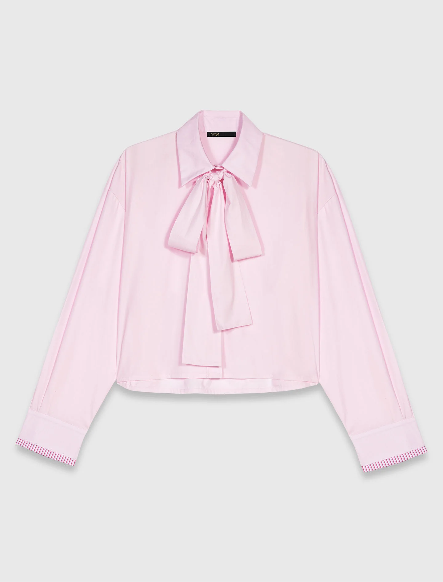 Short shirt with pussy bow This season, Maje plays with details to reinvent wardrobe essentials. With its 2-in-1 style contrasting cuffs, removable tie to knot at the back, and structured short cut, this short poplin shirt embodies effortless chic. To complete the look, opt for a short skirt and signature leather ankle boots. - Short poplin shirt - Removable tie to knot - Box pleat on back The model is 5' 11 and wears a size 1. Reference: MFPCM00690_0183 Composition & care Main material: 100% cotton Normal cycle 30° Do not bleach Do not tumble dry Iron at a maximum temperature of 110°C without steam F/ - Professional dry clean, with hydrocarbon solvent, gentle treatment
