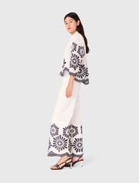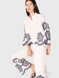 Top court en crochet The studio takes us to Italy, from Milan to Lake Como, for a new take on classic elegance and femininity. A dolce vita style with a touch of humour and plenty of glamour, as always.Ideal for warm weather, this short, loose shirt is embellished with contrasting embroidered flowers. Featuring a Peter Pan collar and button fastening, it has delicately scalloped edges on the bottom and sleeves. - Short shirt with crochet detail - Contrasting embroidered guipure flowers - Scalloped at the bottom - Designed for a boxy fit Reference: MFPCM00707_O025 Composition & care Main material: 100% cotton Embroidery: 100% polyester Regular cycle 30° Do not bleach Do not tumble dry Iron at a maximum temperature of 110°C without steam F - Professional dry clean, with hydrocarbon solvent, normal treatment