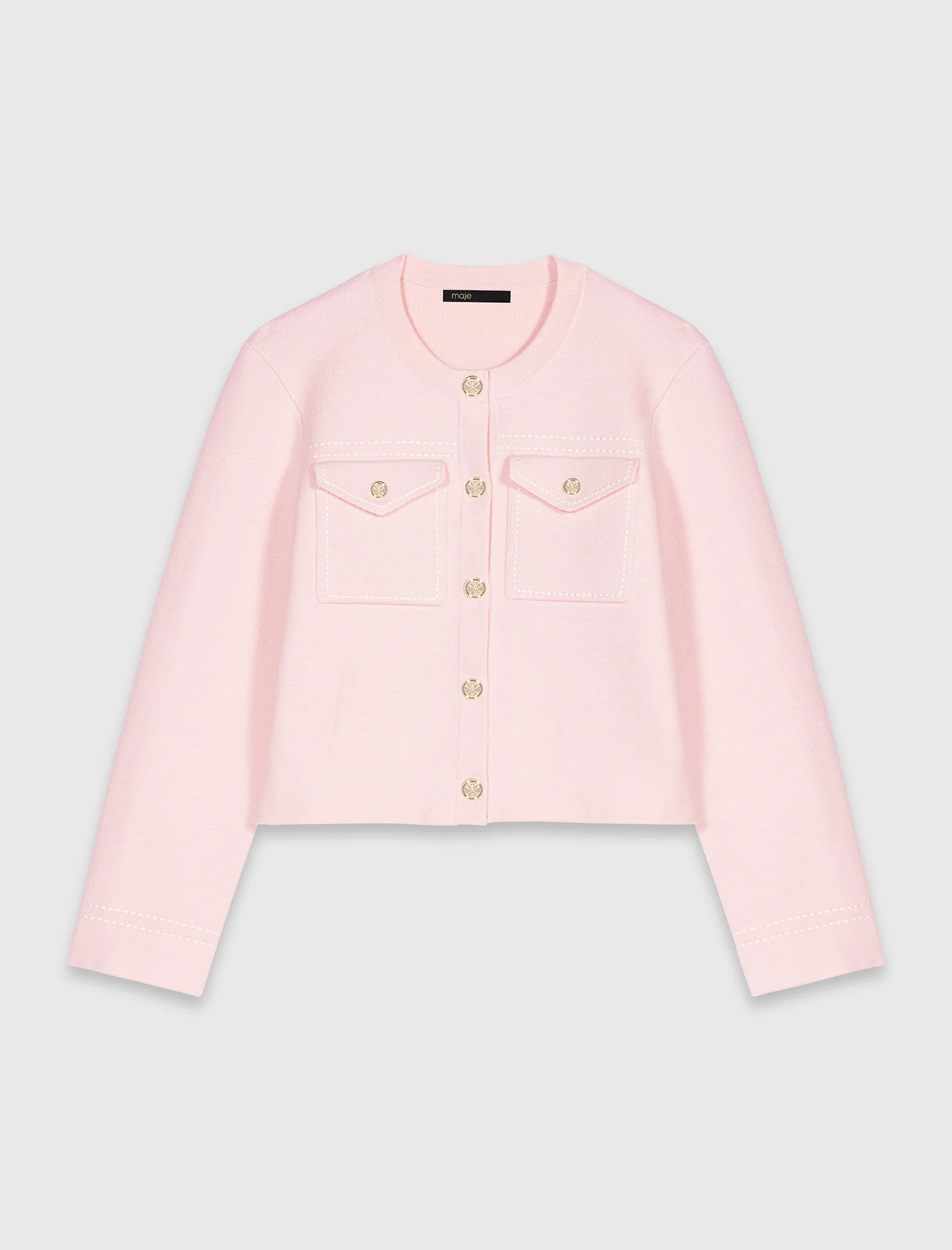 Topstitched cropped cardigan Maje offers a metropolitan collection, combining modernity and a preppy spirit for a smooth transition through the seasons. This short knit cardigan, adorned with contrasting topstitching, adds a touch of sophistication to your look. Featuring a round neck and long sleeves, it reveals patch pockets with flaps and a button fastening. Ideal for mid-season, wear it with a casual T-shirt and faded jeans, enhanced with signature accessories. - Short knit jacket with contrasting topstitching - Round neck and long sleeves - 2 patch pockets with flaps on the chest - Decorative press-stud fastening The model is 5' 9 and wears a size 1. Reference: MFPCA00609_0183 Composition & care Main material: 45% cotton, 28% acrylic, 16% wool, 10% polyamide, 1% elastane Topstitching: 100% polyester Rib: 39% cotton, 25% acrylic, 20% polyamide, 14% wool, 2% elastane Hand wash Do not bleach Do not tumble dry Iron at a maximum temperature of 110°C without steam F - Professional dry clean, with hydrocarbon solvent, normal treatment