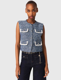 Tweed jacket Nautical style and tailoring come together in this tweed waistcoat, where contemporary energy meets assertive style. Cut from a marled tweed in shades of blue and white, it has an appealing boxy structure, metal buttons and flaps outlined with white trim for a textured, graphic touch. Wear it with fitted raw denim jeans and black loafers for an elegant, modern look. - Blue and white marled cotton tweed waistcoat - Contrasting white pocket trims - Five silver-tone metal buttons - Short, boxy fit - Four decorative pocket flaps The model is 5' 9 and wears a size FR 36. Reference: MFPTO01243_0201 Composition & care Main material: 67% cotton, 27% polyester, 6% polyamide Lining: 100% viscose Braid: 100% polyester Do not wash Do not bleach Do not tumble dry Iron at a maximum temperature of 110°C without steam F/ - Professional dry clean, with hydrocarbon solvent, gentle treatment
