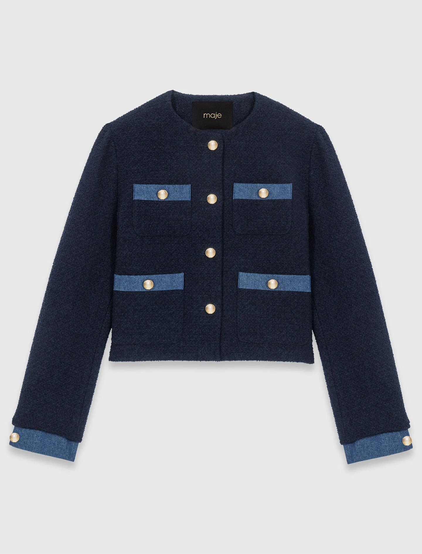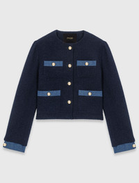 Tweed jacket with denim trim The studio infuses the iconic tweed jacket with a metropolitan, contemporary energy, giving it a twist with bold denim finishes. Its straight, cropped cut, featuring four flap pockets and domed silver-tone buttons, subtly plays on contrasts of texture and colour for a structured, assertive look. Pair it with a navy blue ruffled skirt, a colourful knitted polo top and patent loafers for a preppy-chic look, finished with high socks. - Cropped boucle tweed jacket - Contrasting denim panels - Five silver-tone metal button fastening - Four denim flap pockets - Wide buttoned denim cuffs - True to size The model is 5' 9 and wears a size FR 36. Reference: MFPVE00757_0103 Composition & care Main material: 53% polyester, 28% cotton, 18% viscose, 1% elastane Lining: 100% viscose Secondary material: 100% cotton Do not wash Do not bleach Do not tumble dry Iron at a maximum temperature of 110°C without steam F/ - Professional dry clean, with hydrocarbon solvent, gentle treatment