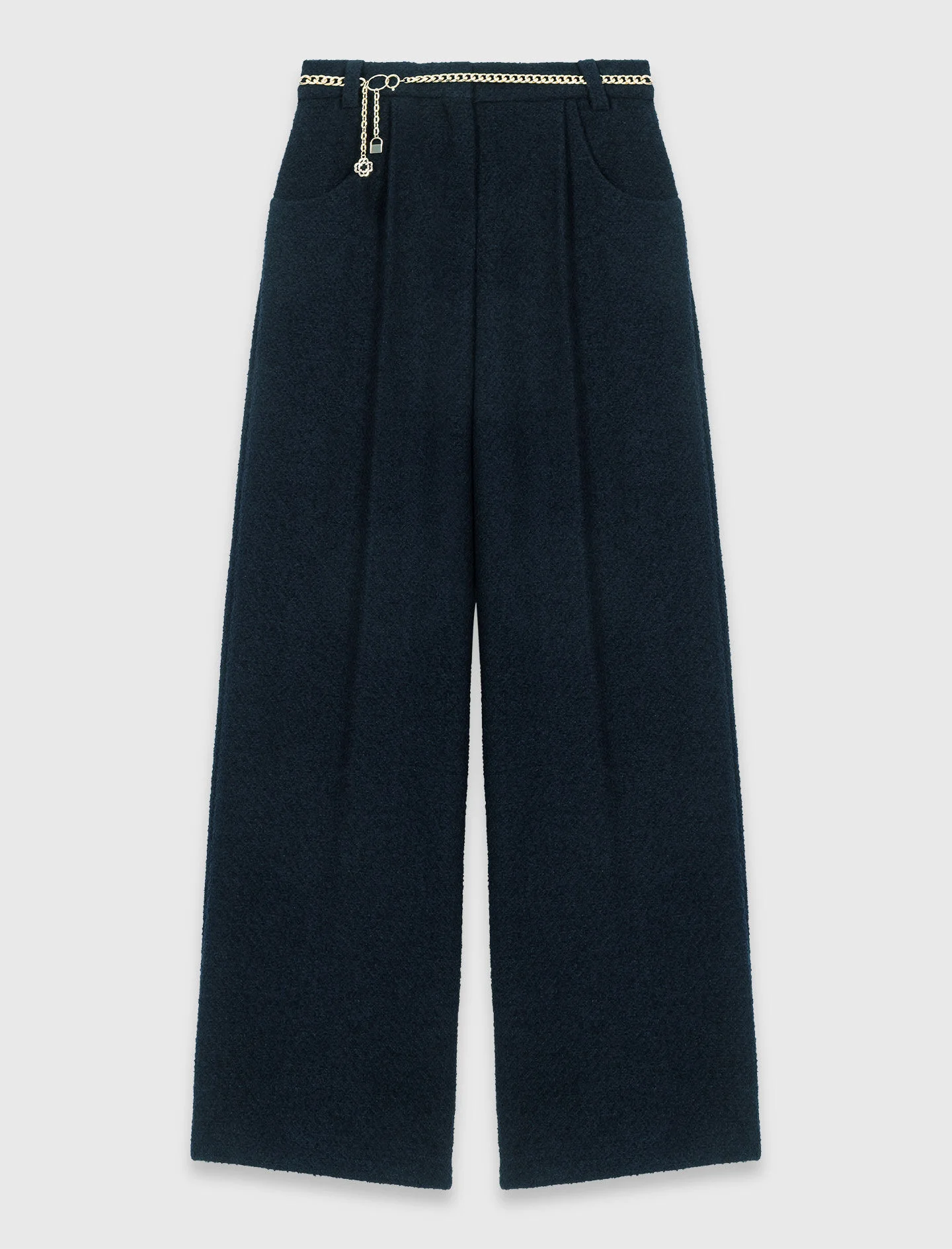 Tweed trousers A spirit of exploration inspires an assertive look, where rich materials and precious details intertwine to create a new kind of elegance. These wide-leg trousers in navy boucle tweed play on texture and light, accentuating the waist with a gold chain belt punctuated by a Clover charm. Sharp creases and a structured cut create a sophisticated silhouette, enhanced by a signature detail that catches the light with every movement. Pair them with layered light pink and navy blue knit polo shirts and black loafers. - Wide-leg tweed trousers - Gold chain belt with charms - Structured high waist - Two side pockets Reference: MFPPA00779_0103 Composition & care Main material: 53% polyester, 28% cotton, 18% viscose, 1% elastane Pocket lining: 100% cotton Do not wash Do not bleach Do not tumble dry Iron at a maximum temperature of 110°C without steam F/ - Professional dry clean, with hydrocarbon solvent, gentle treatment