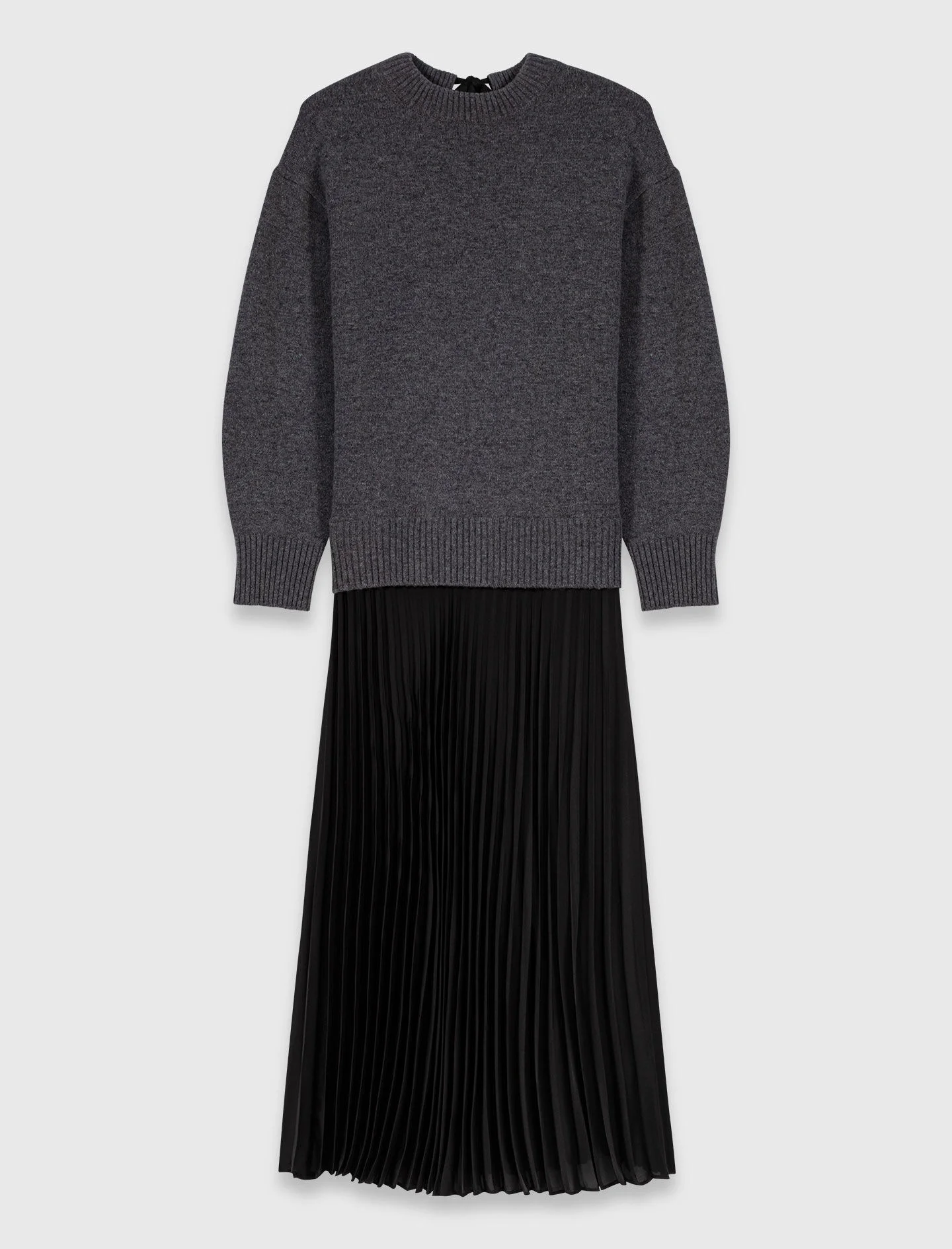 Dual-material maxi dress This maxi dress plays on contrasting materials for a well-executed layered look. The soft knit top has an oversized jumper style, punctuated by a subtle black bow at the back. Below, a light and floaty black pleated skirt structures the silhouette and balances the outfit. Wear with chunky boots and a soft, textured bag to accentuate the modern, cocooning feel. A complete piece, designed to be an outfit in itself. - Two-in-one effect maxi dress - Soft knit top with ribbed trim - Tie fastening at the back - Pleated skirt - Designed for a boxy fit The model is 5' 10 and wears a size 36. Reference: MFPRO04479_0284 Composition & care Top: 89% wool, 5% cashmere, 5% polyamide, 1% elastane Secondary material: 70% polyester, 30% elastomultiester Rib: 89% wool, 5% cashmere, 5% polyamide, 1% elastane Hand wash Do not bleach Do not tumble dry Iron at a maximum temperature of 110°C without steam F - Professional dry clean, with hydrocarbon solvent, normal treatment