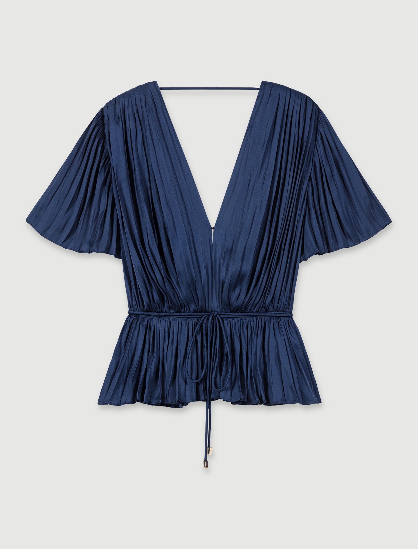 Pleated short-sleeved top An ode to versatility, the new Maje collection uses comforting fabrics and timeless colours to make your daywear and evening wear look simply sublime. Featuring a V-neckline and short butterfly sleeves, this pleated top appeals for its satin-effect fabric and flattering cut. Emphasize your waist with the ties to create a floaty, flared effect at the bottom. Why is it so irresistible? The backless design subtly reveals a glimpse of skin. Mix and match it with jeans, pumps and a shoulder bag for a chic, casual outfit. - Satin-effect top - V-neck - Short butterfly sleeves - Ties - Basque - Backless The model is 5' 10 and wears a size 36. Reference: MFPTO01076_0103 Composition & care Main fabric: 100% polyester Hand wash Do not bleach Do not tumble dry Do not iron F/ - Professional dry clean, with hydrocarbon solvent, gentle treatment