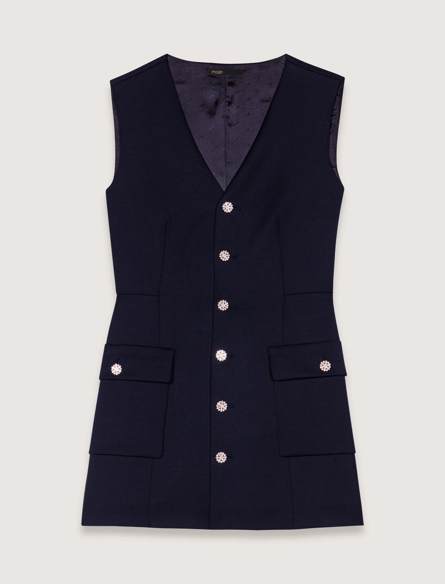 Layered-effect wool-blend jumpsuit The studio has reinterpreted the Parisian office glam wardrobe with a touch of Italian elegance. Made from a wool blend with a satin lining, this sleeveless mini dress with built-in shorts is inspired by men's wardrobes for an outfit that's both elegant and structured. It features a V-neckline and flap pockets. A jewellery button fastening with rhinestones and pearls adds a touch of sparkle. It's a chic accessory that you can accessorise to suit your mood with either formal pumps or more casual ballet flats. - Layered-effect short menswear-style dress in wool blend - Sleeveless - V-neck - 2 flap pockets - Jewellery button fastening with rhinestones and pearls - Satin-effect lined interior The model is 5' 10 and wears a size FR 36. Reference: MFPCO00347_0103 Composition & care Main material: 54% polyester, 44% virgin wool, 2% elastane Lining: 100% viscose Fusible interfacing: 100% polyester Do not wash Do not bleach Do not tumble dry Iron at a maximum temperature of 110°C without steam F/ - Professional dry clean, with hydrocarbon solvent, gentle treatment
