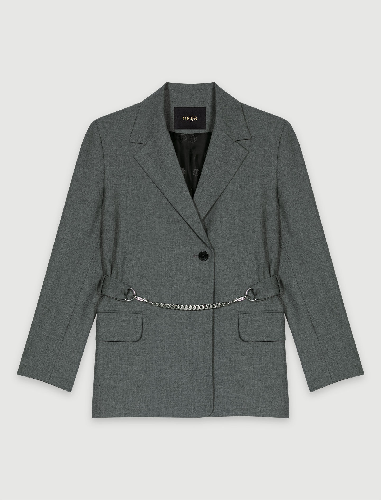 Suit jacket with chain belt Inspired by the British bourgeois wardrobe, the classics are reinvented and updated with sexy details to give your silhouettes a new twist. Ideal for both office and formal wear, this straight-fit suit jacket creates a structured, alluring silhouette. Featuring a monogrammed lining and shirt collar, it has long sleeves, buttoned cuffs, flap pockets and a vent at the back. It emphasises the waist elegantly: embellished with a removable belt with lobster clasps and metal chains, it adjusts with press studs and a button fastening. Go for the total look by teaming it with matching trousers and a top, then add a bag and platform sandals. - Straight-fit tailored blazer jacket - Removable chain belt - Button fastening The model is 5' 9 and wears a size 36. Reference: MFPVE00508_0505 Composition & care Main fabric: 57% polyester, 22% wool, 17% viscose, 4% elastane Lining: 100% viscose Do not wash Do not bleach Do not tumble dry Iron at a maximum temperature of 110°C without steam F - Professional dry clean, with hydrocarbon solvent, normal treatment