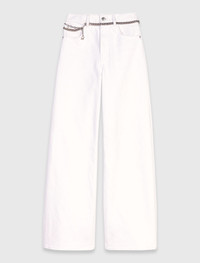 High-waisted wide-leg jeans With its straight line and mid-rise waist highlighted by a removable chain belt with tassels, these jeans add rhythm to the silhouette. The Clover jacron on the back signs off this must-have piece of the collection. Add a printed top and a matching bucket hat to complete the look. - Wide-leg straight-cut jeans - 5 pockets - Clover jacron on the back - Removable chain belt with tassels The model is 5' 9 and wears a size 36. Reference: MFPJE00722_10 Composition & care Main material: 99% cotton, 1% elastane Pocket lining: 67% polyester, 33% cotton Jacron: calfskin leather Regular cycle 30° Do not bleach Do not tumble dry Iron at a maximum temperature of 110°C without steam F - Professional dry clean, with hydrocarbon solvent, normal treatment