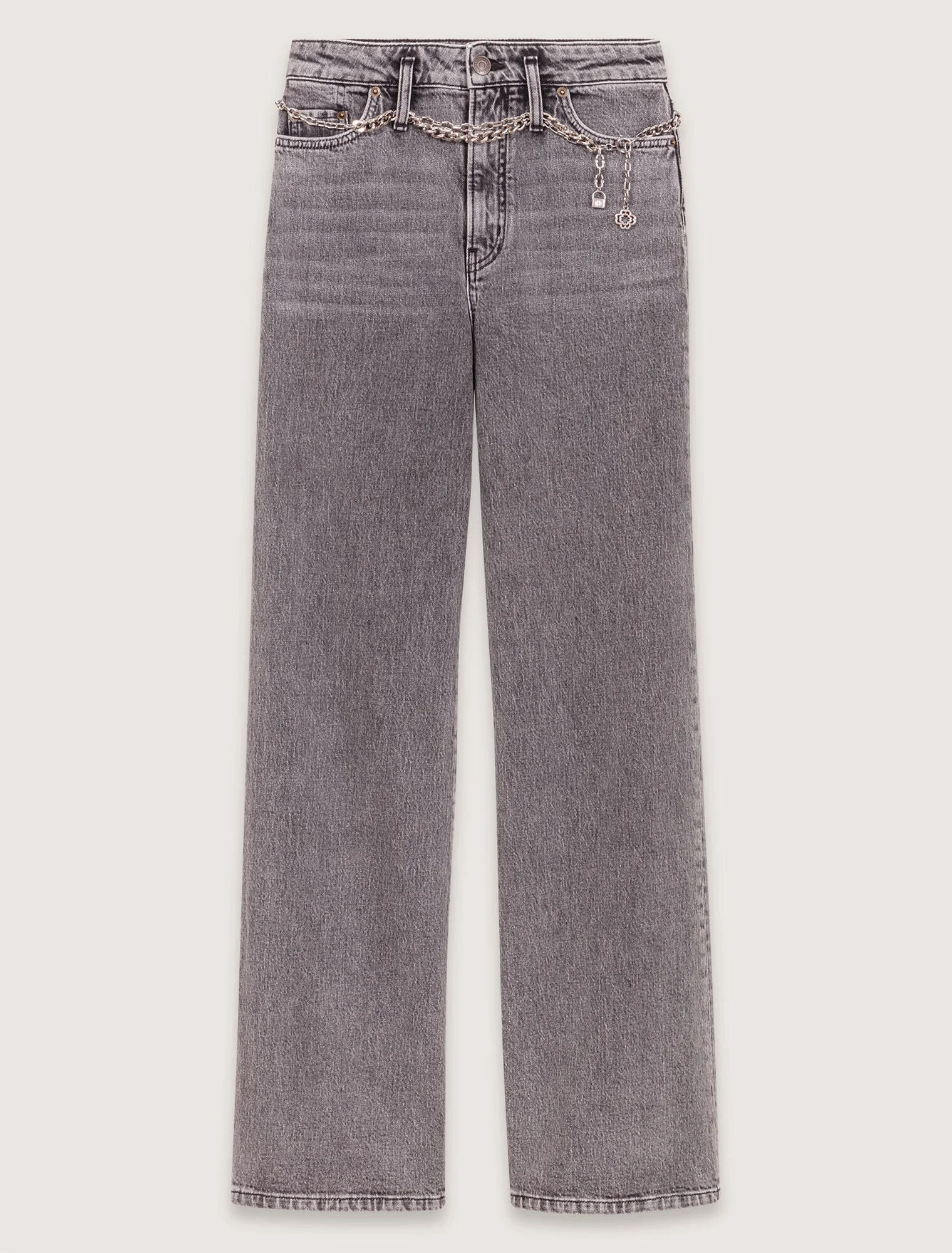 Wide-leg jeans with chain-link belt This winter, the studio has created an ode to timeless Parisian elegance. From preppy everyday wear to glittering evening events, the new collection is all about sophistication and boldness, in a subtle interplay of colours and cuts. These stonewash denim jeans feature a signature detail: a chain-link belt embellished with Clover charms and padlock. Its wide-leg cut, structured by five pockets, is full of casual elegance. For wearing when the mood strikes you, mix and match it with a jumper, ankle boots and a shoulder bag. - Stonewash denim jeans - Chain belt with Clover charms and padlock - 5 pockets - Belt loops - Zip and button fastening - Clover jacron on the back Reference: MFPJE00822_0505 Composition & care Main material: 99% cotton, 1% elastane Pocket lining: 67% polyester, 33% cotton Jacron: calfskin leather Regular cycle 30° Do not bleach Do not tumble dry Iron at a maximum temperature of 110°C without steam F - Professional dry clean, with hydrocarbon solvent, normal treatment