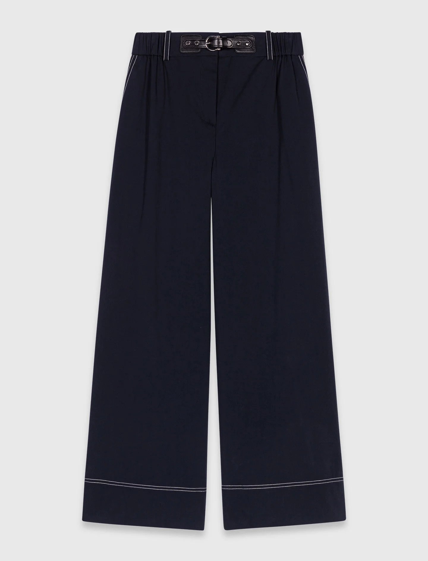 Cotton trousers with leather belt A wardrobe where modernity and comfort meet. Maje reinvents the season's basics with timeless elegance. These canvas trousers with contrasting topstitching and an elasticated waist combine comfort and structure. The belt detail at the waist provides a perfect fit. An essential to adopt from the start of the season, pair with a striped knit top, chunky loafers and a signature bag for a look that's as elegant as it is casual. - Canvas trousers with contrasting topstitching - Elasticated waist - Belt tab with buckle and belt loops - Designed for a boxy fit The model is 5' 10 and wears a size 36. Reference: MFPPA00736_0103 Composition & care Main material: 69% cotton, 28% polyamide, 3% elastane Patch: 100% polyester Pocket lining: 100% cotton Regular cycle 30° Do not bleach Do not tumble dry Iron at a maximum temperature of 110°C without steam F/ - Professional dry clean, with hydrocarbon solvent, gentle treatment