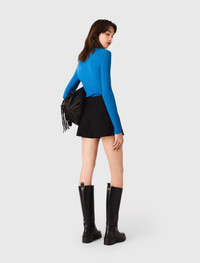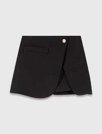 Layered-effect suit shorts A cross between structured tailoring and a graphic silhouette, these black layered-effect shorts are a bold new take on the mini skirt. Their asymmetrical panel adds movement and modernity, accentuated by a fitted waist and a discreet button detail. The overall look evokes a metropolitan elegance, designed for playing with contrasting styles. Pair with a colourful, close-fitting jumper and high boots for a contemporary retro look. You could also team them with an oversized jacket for a more assertive take on feminine tailoring. - Layered-effect wrap skort - Asymmetrical panel with button and side slit - Semi-elasticated waist - Zip fastening at the back - Mock front pocket detail - Designed for a standard fit The model is 5' 10 and wears a size 36. Reference: MFPSH00685_2517 Composition & care Main material: 52% polyester, 26% wool, 18% viscose, 4% elastane Inner fabric: 100% polyester Gentle cycle 30° Do not bleach Do not tumble dry Iron at a maximum temperature of 110°C without steam F/ - Professional dry clean, with hydrocarbon solvent, gentle treatment