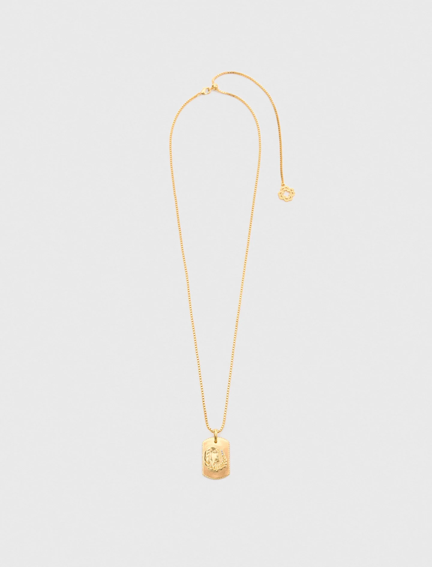 Zodiac sign plaque necklace Designed as modern talismans, Maje jewellery combines symbols and sparkle to suit all your desires and styles. This gold necklace reimagines the military tag in a precious version, adorned with rhinestones on the edges and a zodiac sign in the centre. The fine, adjustable chain allows it to be worn alone or layered. - Chain necklace with astrological sign plaque - Set with rhinestones on the edges - Adjustable clasp with extension chain Reference: MFABI01066 Composition & care Stones: 100% zirconium oxide Chain: 100% brass Do not wash Do not bleach Do not tumble dry Do not iron Do not dry clean