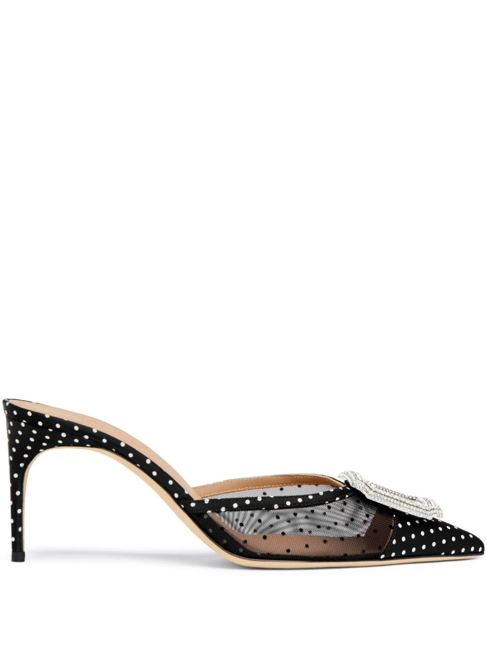70mm Mona mules Highlights - Black - Polka dot print - Crystal buckle detail - Stiletto heel Made in Italy Composition Outer: Satin 50%, Mesh 50% Lining: Calf Leather 100% Sole: Calf Leather 100% SIZE & FIT Measurement HEEL 2.75 in(7 cm)