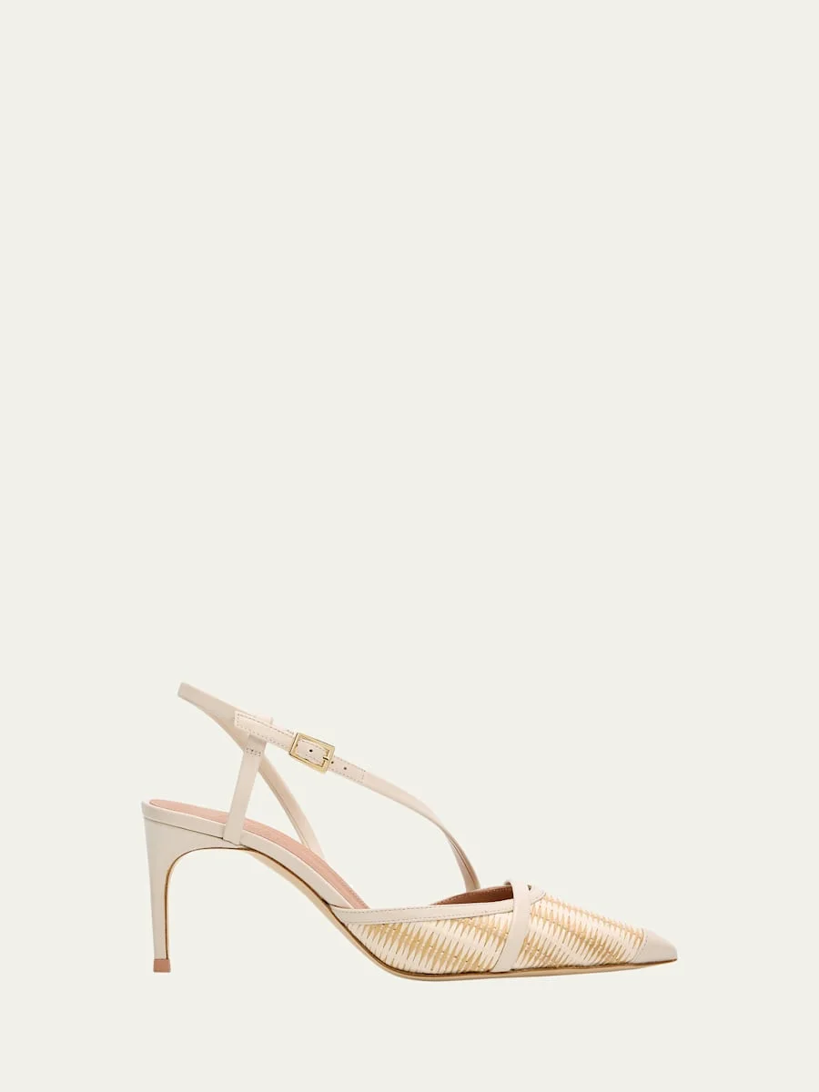The "Valeria" pumps by Malone Souliers are crafted from leather and bicolor woven raffia 2.75 in / 70 mm stiletto heel Pointed toe Asymmetric slingback strap Lining: Leather Made in Italy