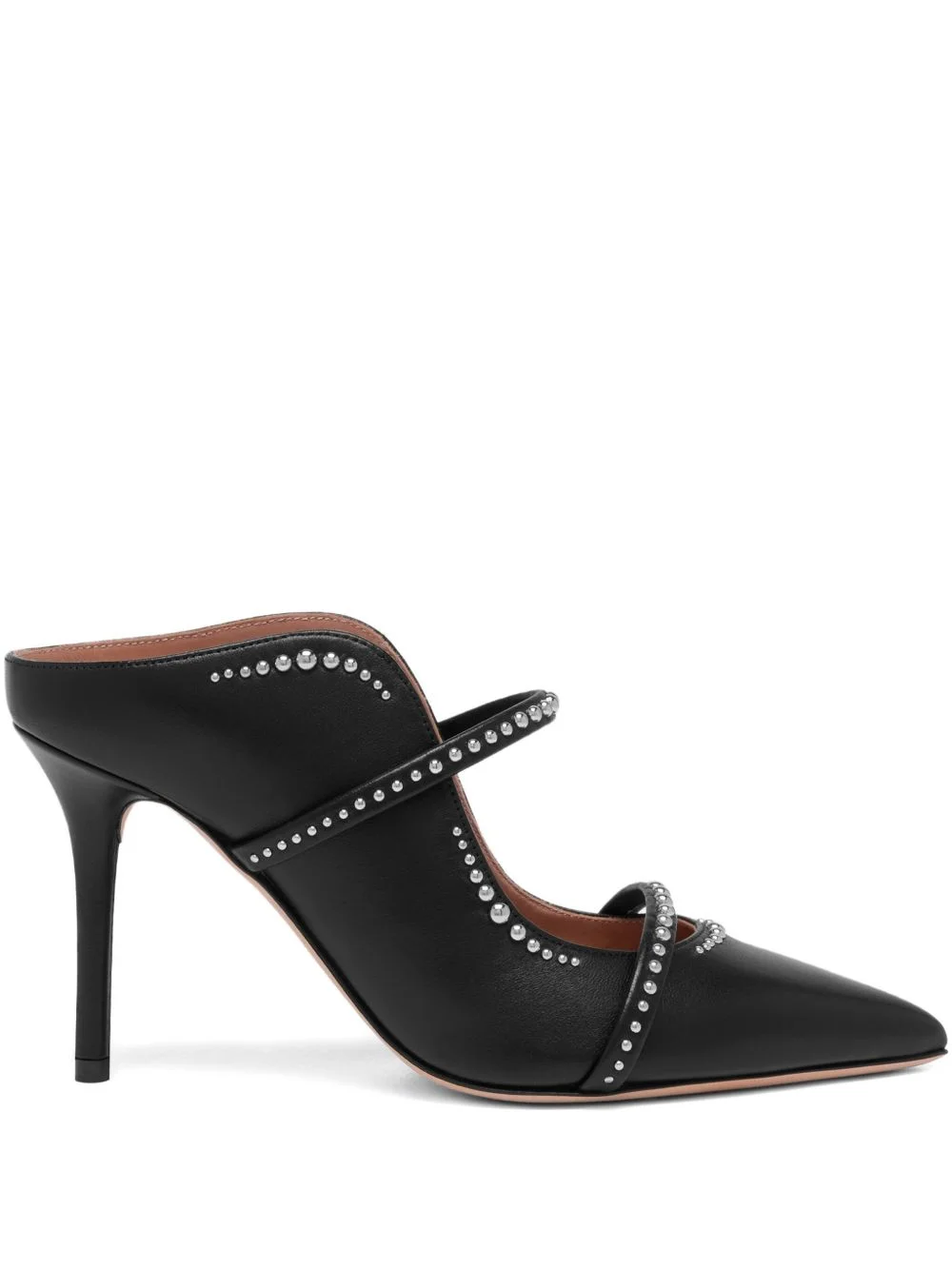 85mm Maureen mules Highlights - Black - Slip-on style - High stiletto heel - Crystal embellishment - Pointed toe Made in Italy Composition Outer: Nappa Leather 100% Sole: Leather 100% Lining: Calf Leather 100% SIZE & FIT Measurement HEEL 3.34 in(8.5 cm)