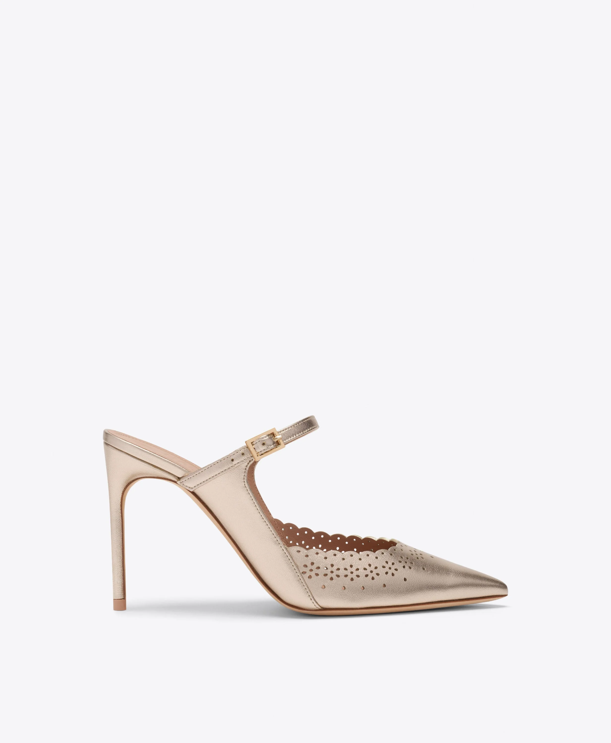 A statement mule that balances 70s attitude with artisanal craft. The Bardot mule is defined by a pointed toe and delicate buckle strap. Elevated with intricate laser-cut detailing inspired by traditional broderie Anglaise, it's set on a 90mm stiletto heel that brings a sense of drama to the season. - Colour: Champagne - Material: Metallic Nappa - Sole and Lining: 100% Leather - Style: Mules - Handmade in Italy - Fitting: True to size SIZE & FIT - Fits true to size - Italian sizing - Model wears size IT37, US7, UK4 - Heel height 90mm/3.5in