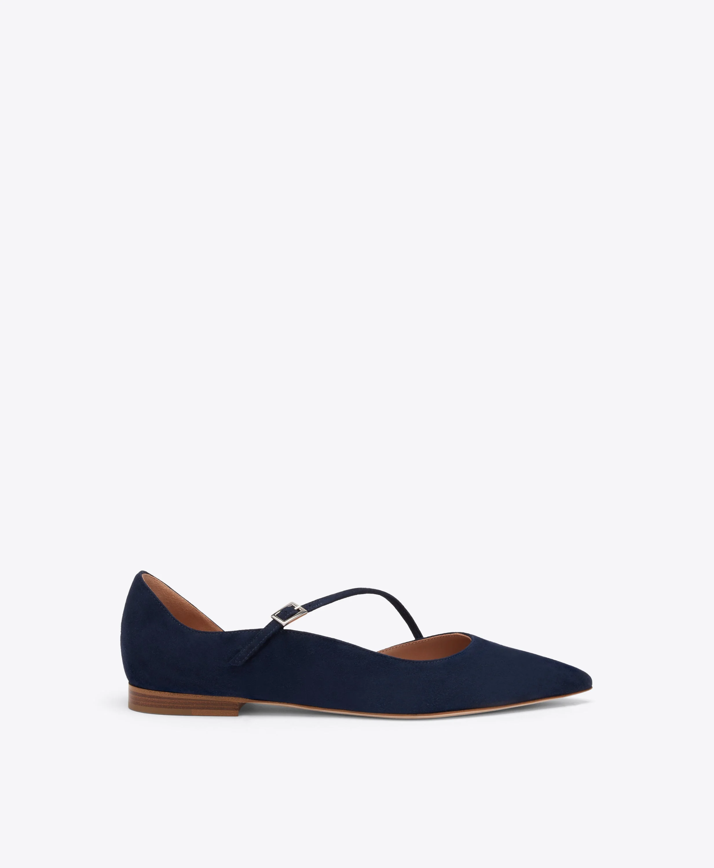 The Bettina flat pump debuts in deep midnight suede. A reimagining of Malone Souliers' signature curves, its pointed D’Orsay silhouette is defined by a slender diagonal strap and angular buckle. Set on a low monoblock heel, Bettina brings ease, elegance, and everyday versatility in equal measure. - Colour: Midnight - Material: Suede - Sole and Lining: 100% Leather - Style: Flat Pumps - Handmade in Italy - Fitting: True to size SIZE & FIT - True to size - Italian sizing - Model wears size IT37, US7, UK4 - Heel height 10mm/0.4in