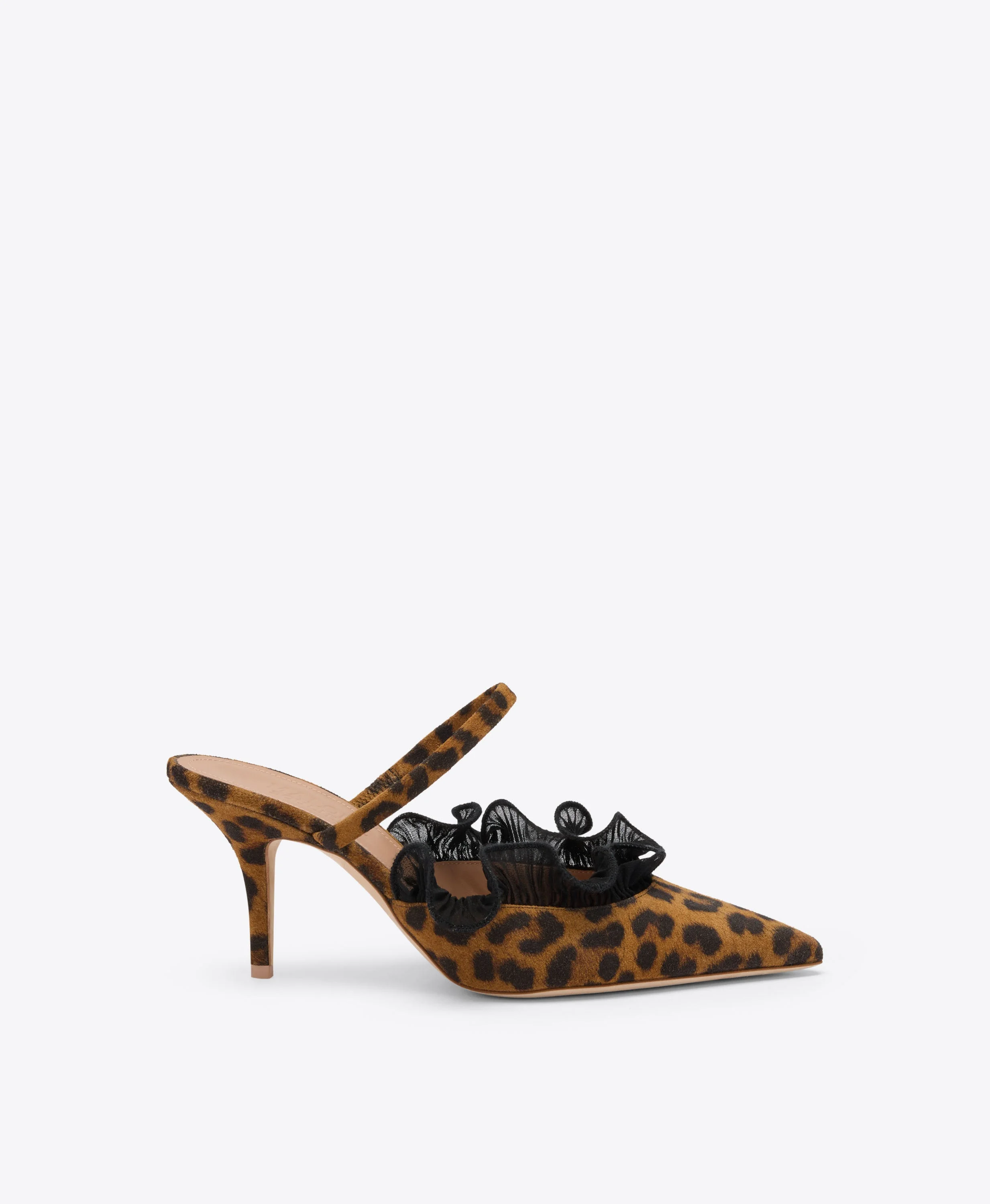 Inspired by cinema’s most iconic looks, Cecile balances boldness with romance. Crafted in leopard-print suede, this statement mule is defined by a fluttering organza ruffle that softens its sharp, sculptural lines. The sharply pointed toe and 70mm stiletto heel create a sculptural silhouette that plays with contrast. - Colour: Brown/Black - Material: Leo Crosta Suede/Organza - Sole and Lining: 100% Leather - Style: Heeled Mules - Handmade in Italy - Fitting: True to size SIZE & FIT - True to size - Italian sizing - Model wears size IT37, US7, UK4 - Heel height 70mm/2.7in