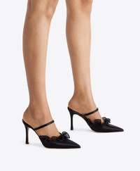 A study in shadow, softness and sculptural form. The Cecile mule arrives in lustrous black satin, accented by a delicate organza ruffle that sweeps across the foot. Finished with a sharply pointed toe and 90mm stiletto heel, this silhouette brings cinematic sensuality to every step. - Colour: Black - Material: Satin/Organza - Sole and Lining: 100% Leather - Style: Heeled Mules - Handmade in Italy - Fitting: True to size SIZE & FIT - True to size - Italian sizing - Model wears size IT37, US7, UK4 - Heel height 70mm/2.7in