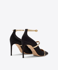 A refined take on evening glamour. The Diaz pump shines in black satin, contrasted by three slender straps in antique gold metallic leather. Set on a 90mm stiletto heel with a sharply pointed toe, this sculptural silhouette is perfect for after-dark occasions. - Colour: Black/Antique Gold - Material: Satin/Metallic Nappa - Sole and Lining: 100% Leather - Style: Heeled Pumps - Handmade in Italy - Fitting: True to size SIZE & FIT - Fits large to size, half size down is recommended - Italian sizing - Model wears size IT37, US7, UK4 - Heel height 90mm/3.5in