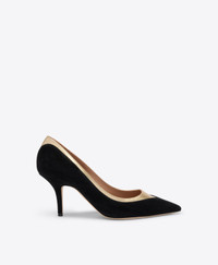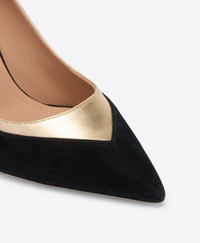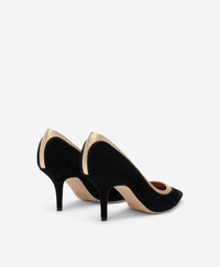 A forever classic with a gilded edge. Crafted in black suede and trimmed with gleaming gold metallic leather, this Emmanuelle pump is a website exclusive for SS26. Its pointed toe and cut-out detailing create a modern frame, while the 70mm stiletto heel brings day-to-night elegance. - Colour: Black/Antique Gold - Material: Suede/Metallic Nappa - Sole and Lining: 100% Leather - Style: Pumps - Handmade in Italy - Fitting: True to size - Online Exclusive SIZE & FIT - Fits true to size - Italian sizing - Model wears size IT37, US7, UK4 - Heel height 70mm/2.7in