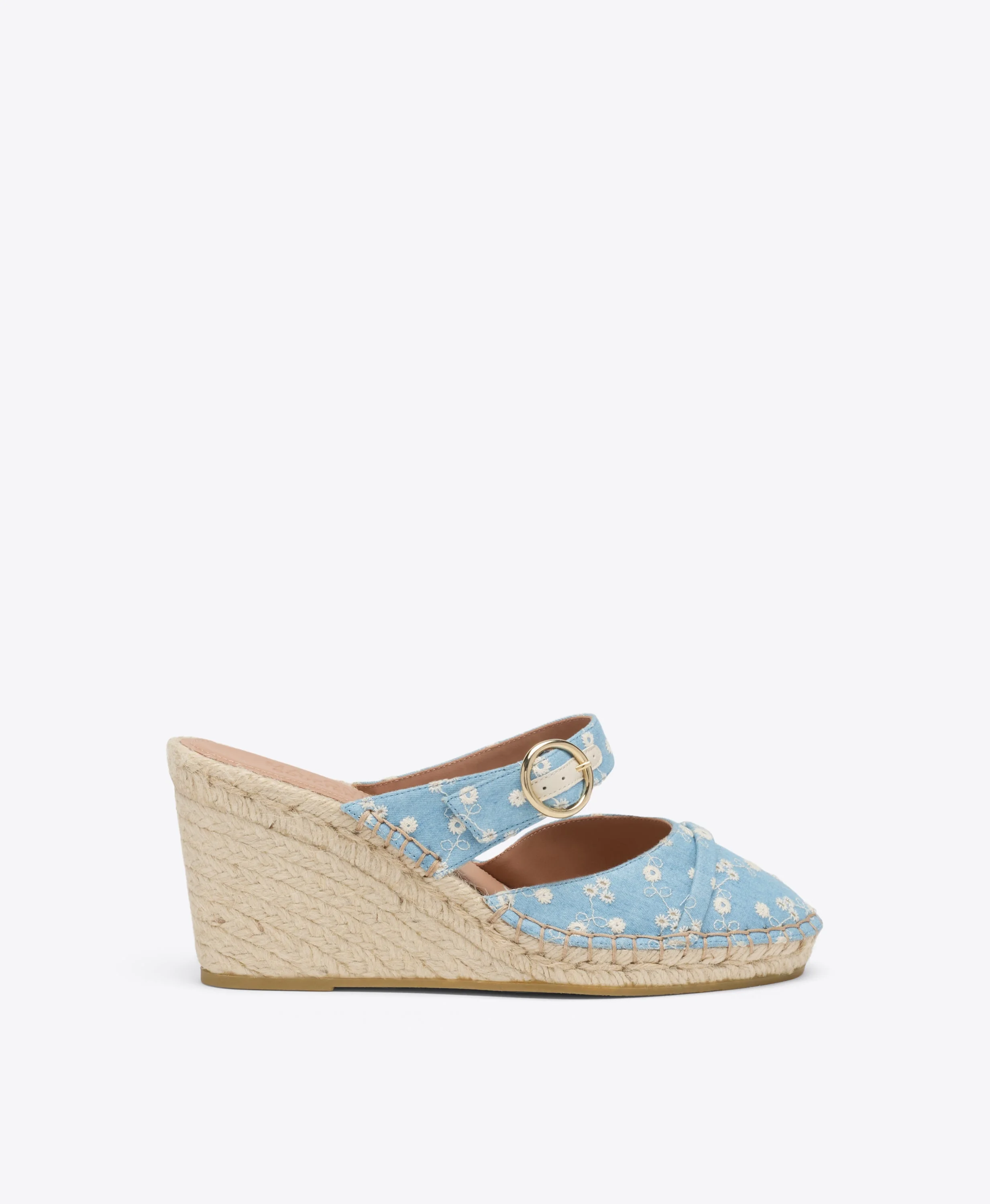 A statement silhouette echoing the icons of eras past. New for the season, the Farah mule is crafted in Italy from blue floral denim and set on a woven 70mm espadrille wedge that channels the carefree spirit of 1970s summers. With a closed toe and delicate round buckle, it reimagines retro influences. - Colour: Blue/Cream - Material: Floral Denim - Sole and Lining: 100% Leather - Style: Wedge Mules - Handmade in Italy - Fitting: True to size SIZE & FIT - True to size - Italian sizing - Model wears size IT37, US7, UK4 - Heel height 70mm/2.7in
