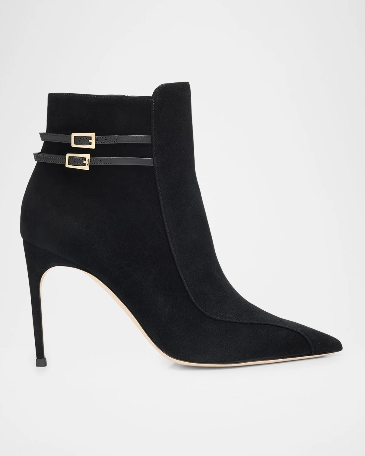 Adorned with smooth leather buckles, the Giordana booties by Malone Souliers are crafted from supple goat suede 3.50 in / 90 mm covered stiletto heel Pointed toe Adjustable side buckle straps Side zip eases dress Made in Italy