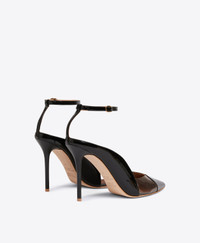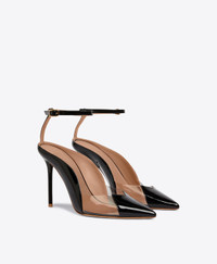 Malia brings bold definition to evening dressing. Set atop a softly tapered 100mm stiletto heel, this pointed-toe pump is crafted from glossy black patent leather and framed with smoked PVC panels for a play on contrast and transparency. The M-shaped toe cap adds intrigue, while an adjustable ankle strap ensures a tailored fit. - Colour: Black - Material: PVC/Patent - Sole and Lining: 100% Leather - Style: Heeled Pumps - Handmade in Italy - Fitting: True to size SIZE & FIT - True to size - Italian sizing - Model wears size IT37, US6.5, UK4 - Heel height 100mm/4in