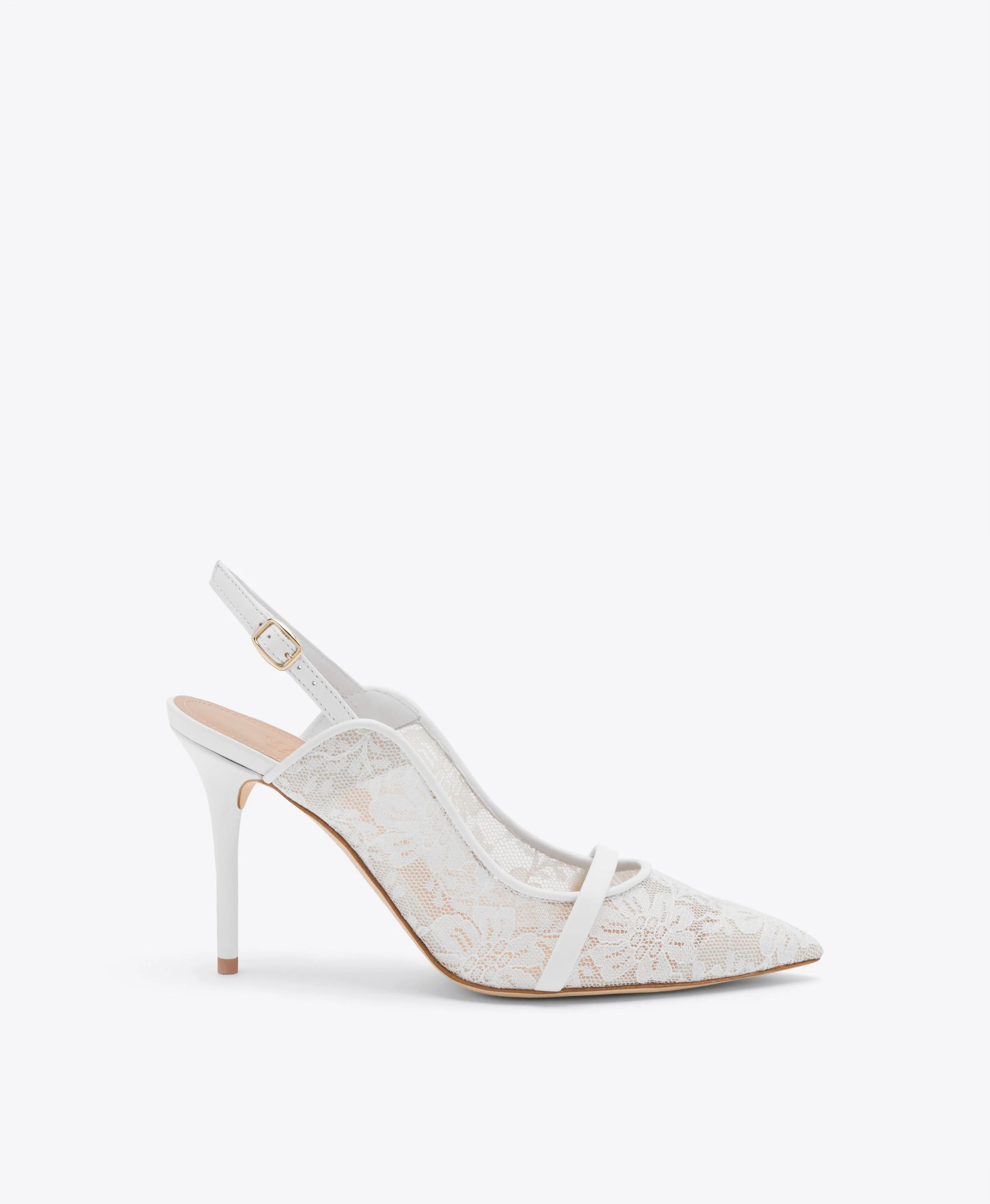 Exquisite in every detail, the Marion slingbacks are the perfect bridal statement. Beautifully crafted from delicate white lace mesh, these pointed-toe slingbacks feature a refined strap and are set on a graceful 80mm stiletto heel. With their elegant silhouette, timeless design and intricate details, they offer the perfect combination of comfort and sophistication for your special day. - Colour: White - Material: Lace Mesh/Nappa - Sole and Lining: 100% Leather - Style: Heeled Slingbacks - Handmade in Italy - Fitting: Fits small to size, take half a size larger SIZE & FIT - Fits small to size, take half a size larger - Italian sizing - Model wears size IT37, US7, UK4 - Heel height 85mm/3.3in
