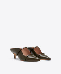 Timeless elegance, reimagined in a rich olive hue. For SS26, the Maureen kitten heel mule returns in a new-season shade of supple Nappa leather. Its pointed toe and signature double straps frame the foot with sculptural precision, while the 45mm heel offers the perfect balance of comfort and style. - Colour: Olive - Material: Nappa - Sole and Lining: 100% Leather - Style: Kitten Heels - Handmade in Italy - Fitting: Fits small to size, take half a size larger SIZE & FIT - Fits small to size, take half a size larger - Italian sizing - Model wears size IT37, US7, UK4 - Heel height 45mm/1.7in